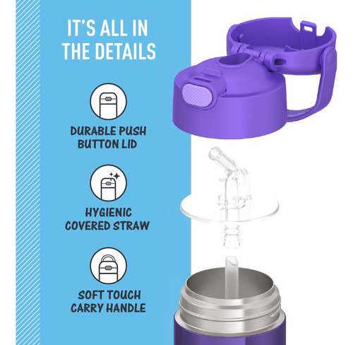 As crianças adoram produtos FUNtainer® da Marca Thermos®, mas os pais adoram ainda mais. A garrafa de água de aço inoxidável sem isolamento de vácuo FUNtainer 12oz com um canudo de silicone mantém bebidas frias por até 12 horas. Não faça de conta necessária. Os produtos FUNtainer são sempre feitos com amor a partir de materiais sem BPA. A construção de aço inoxidável de parede dupla é construída para lidar com gotas, dings e rugosidades variadas. A garrafa de 12oz inclui uma alça de transporte integrada com aderência de toque macio, facilitando para as crianças carregarem com eles durante todo o dia. A pega também pode ser dobrada quando não estiver em uso. Mantenha os germes afastados com a palha higiênica coberta que é removível para facilitar a limpeza. Para limpar, você pode colocar sua garrafa de água FUNtainer na lava-louça; no entanto, a lavagem das mãos é recomendada. Não para uso com líquidos quentes. A garrafa de palha FUNtainer é apoiada por uma garantia limitada de cinco anos