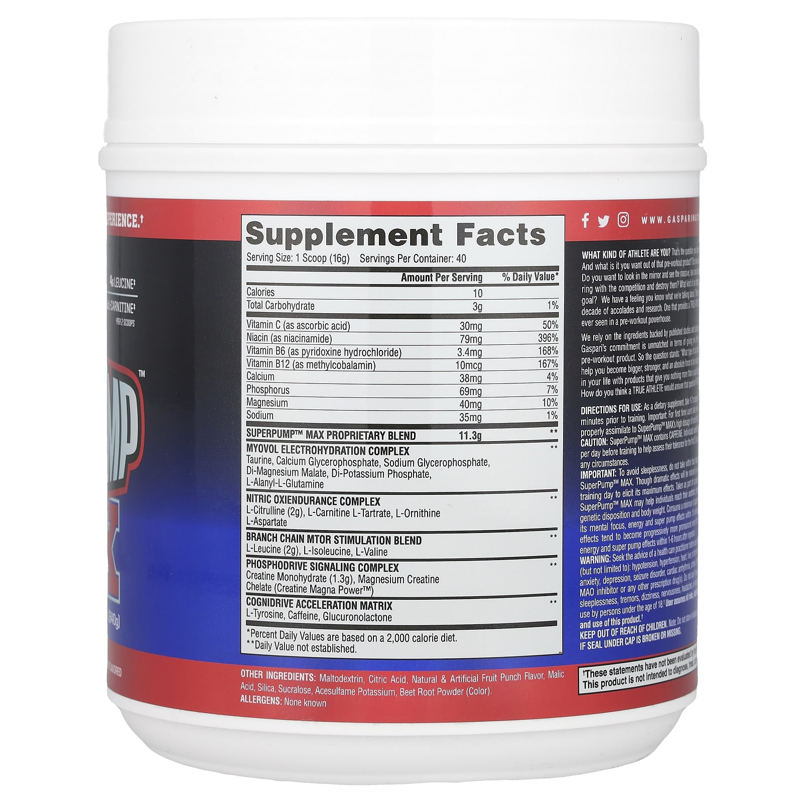 SuperPump™ MAX contém Cafeína. Pessoas sensíveis à cafeína ou a outros estimulantes devem começar usando uma (1) colher medidora por dia antes do treino para ajudar a avaliar sua tolerância nos primeiros 2 a 3 dias. Não exceda mais de três (3) colheres medidoras de cada vez e em nenhuma circunstância.