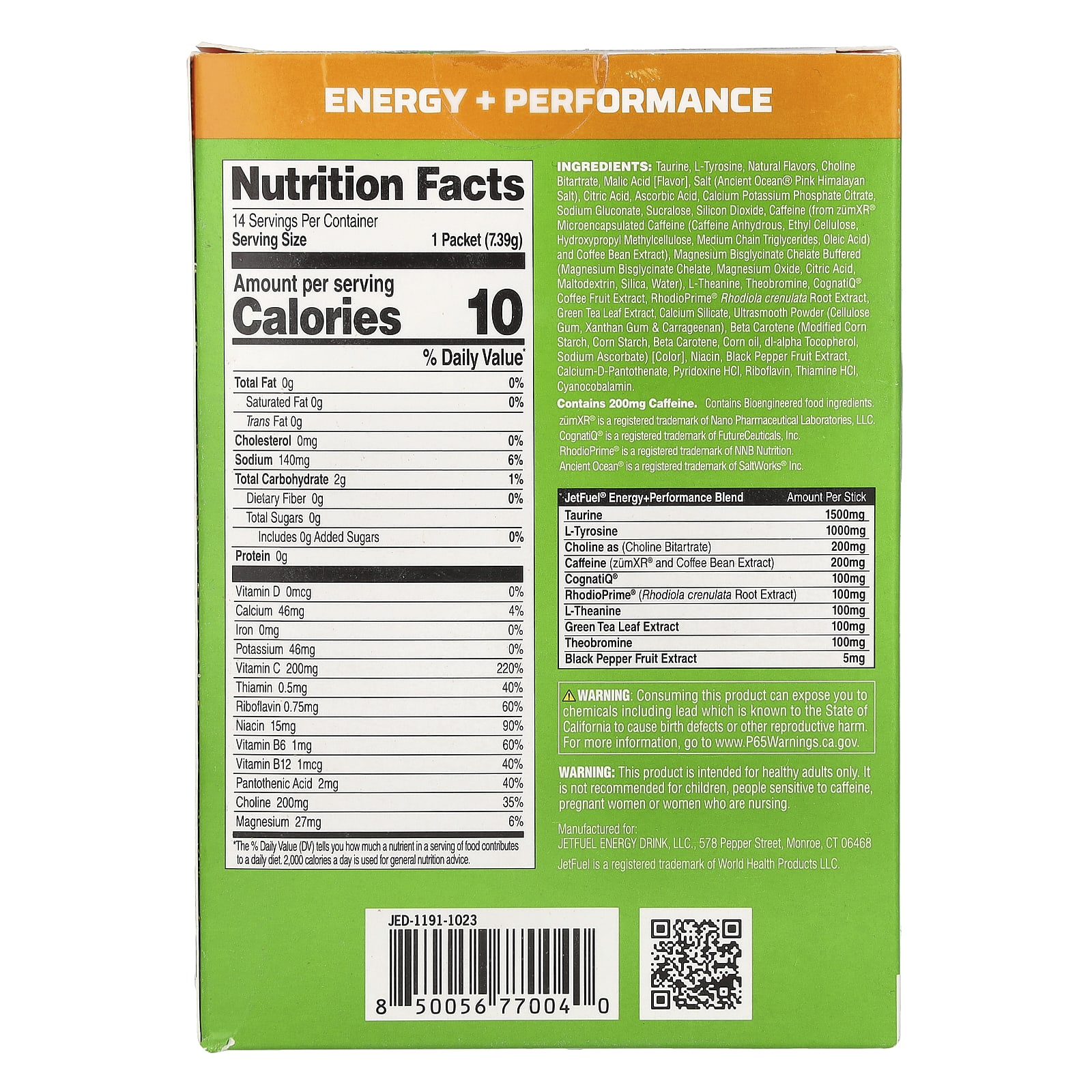 Taurina, l-tirosina, sabores naturais, hemitartarato de colina, ácido málico [sabor], sal (sal rosa do Himalaia da Ancient Ocean®), ácido cítrico, ácido ascórbico, citrato de fosfato de potássio e cálcio, gliconato de sódio, sucralose, dióxido de silício, cafeína (de cafeína microencapsulada zümxr® (cafeína anidra, etilcelulose, hidroxipropilmetilcelulose, triglicerídeo de cadeia média, ácido oleico) e extrato de grãos de café), bisglicinato de magnésio quelato tamponado (bisglicinato de magnésio quelato, óxido de magnésio, ácido cítrico, maltodextrina, sílica, água), a l-teanina, teobromina, extrato do fruto de café cognatiq®, extrato da raiz de Rhodiola crenulata rhodioprim®, extrato da folha de chá verde, silicato de cálcio, pó ultrasuave (goma de celulose, goma xantana & carragenina), betacaroteno (amido de milho modificado, amido de milho, betacaroteno, óleo de milho, dextroalfatocoferol, ascorbato de sódio) [corante], ácido nicotínico, extrato do fruto de pimenta-do-reino, pantotenato de cálcio, cloridrato de piridoxina, riboflavina, cloridrato de tiamina, cianocobalamina.