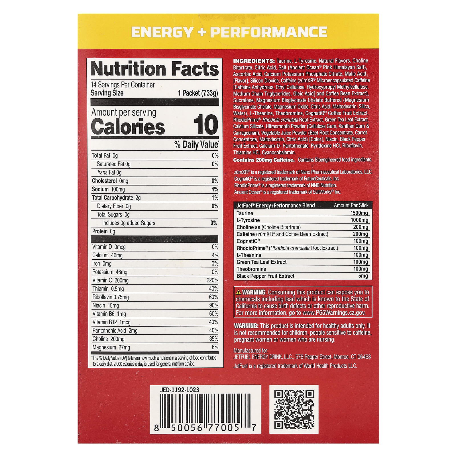 Taurina, l-tirosina, sabores naturais, hemitartarato de colina, ácido cítrico, sal (sal rosa do Himalaia da Ancient Ocean®), ácido ascórbico, citrato de fosfato de potássio e cálcio, ácido málico, [sabor], dióxido de silício, cafeína (cafeína microencapsulada zümxr® [cafeína anidra, etilcelulose, hidroxipropilmetilcelulose, triglicerídeo de cadeia média, ácido oleico] e extrato do grão de café), sucralose, bisglicinato de magnésio quelato tamponado (bisglicinato de magnésio quelato, óxido de magnésio, ácido cítrico, maltodextrina, sílica, água), a l-teanina, teobromina, extrato do fruto de café cognatiq®, extrato da raiz de Rhodiola crenulata rhodioprim®, extrato da folha de chá verde, silicato de cálcio, pó ultrasuave (goma de celulose, goma xantana & carragenina), suco de vegetais em pó (concentrado de beterraba, concentrado de cenoura, maltodextrina, ácido cítrico) [corante], ácido nicotínico, extrato do fruto de pimenta-do-reino, pantotenato de cálcio, Cloridrato de piridoxina, riboflavina, cloridrato de tiamina, cianocobalamina.