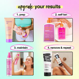 a clear, dark self tan gel enriched with skincare faves hyaluronic acid + vitamin c. so you can get glowin without the tacky tan development time. better yet, the clear, transfer-resistant, rinse-free gel means your glow will get glowin and you can get on your way. – CLEAR SELF TAN GEL. im a transfer-resistant self tan gel that you can apply & go glow your own way… no rinse required – ZERO TRANSFER: The advanced clear tanning gel formula means it wont transfer onto your clothes or stain your sheets. Its a clear self express tan that goes on clear – no rinse required. – TANNING MITT INCLUDED. i come with our best selling mitt so you can create the most awesome, dark tan on the planet – MEGA MOISTURIZING. enriched with hyaluronic acid + vitamin c for that ultra juicy glow. ill leave you with darker tan results + moisturized, smooth skin – SO EASY TO APPLY: The easiest way to self tan. Pump a small amount of tan gel into hands or a mitt, blend thoroughly & evenly, wash your hands, and youre good to go and glow. – MADE IN THE USA: Made by the tanning experts here in the USA. Our state of the art production facilities use only the highest quality ingredients so you know your skin is well looked after.