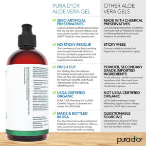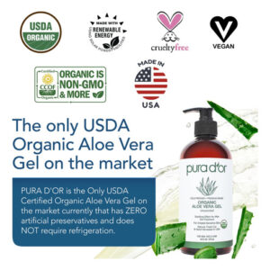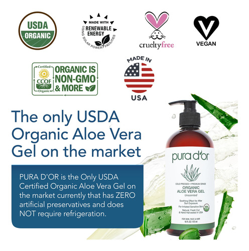Gel de aloe vera orgânico PURA D'OR de 16 onças — Sem perfume — Totalmente natural — ZERO conservantes artificiais — Hidratante e hidratante profundamente — Queimaduras solares, picadas de insetos, erupções cutâneas, cortes pequenos, alívio do eczema — Pele e cabelo — O ÚNICO GEL DE ALOE VERA ORGÂNICO do USDA no mercado: PURA D'OR é o único gel de aloe vera orgânico certificado pelo USDA no mercado atualmente que não tem conservantes artificiais e NÃO requer refrigeração. Outras marcas não têm o selo orgânico do USDA no rótulo, o que significa que elas não são certificadas como orgânicas e quaisquer alegações orgânicas feitas em outros lugares são enganosas e imprecisas. Sempre verifique o selo do USDA no rótulo – HIDRATAÇÃO SUAVIZANTE DA PELE: nosso gel de aloe vera dobrará os benefícios hidratantes versáteis e penetrará profundamente na pele com hidratação superior para uma pele mais clara e saudável – deixando-a com uma sensação e aparência fresca e revitalizada. – Alivia a pele danificada pelo sol: nosso gel de aloe vera para cuidados pós-sol proporcionará à sua pele um alívio calmante dos fatores ambientais e deixará sua pele sedosa, macia e suave, sem qualquer pegajosa ou pegajosa. resíduo. – BENEFÍCIOS NUTRITIVOS E REFRESCANTES PARA PELE, CABELO E COURO CABELUDO: Nosso Aloe Vera orgânico O gel é rico em antioxidantes e nutrientes, incluindo vitaminas C e E, para melhorar a firmeza natural da pele e reduzir a aparência de envelhecimento precoce na pele. O gel de aloe vera para cabelos (assim como para couro cabeludo) promove a hidratação do cabelo e do couro cabeludo para obter cabelos mais sedosos, macios e brilhantes, ao mesmo tempo em que fornece ao couro cabeludo a hidratação necessária para estimular um couro cabeludo com menos coceira e escamação. – GARANTIA DE SATISFAÇÃO: pele saudável, clientes satisfeitos. Oferecemos uma garantia de satisfação. Se você não estiver satisfeito com nosso Gel de Aloe Vera, informe-nos e nós lhe daremos um reembolso TOTAL.