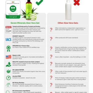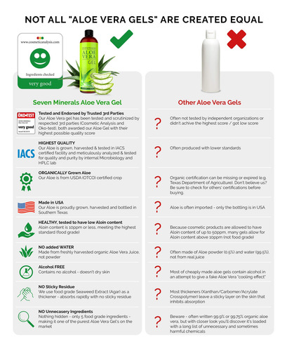 Aloe – #1 DA MAIS ALTA QUALIDADE – para garantir o frescor, nosso Aloe é orgulhosamente cultivado aqui no sul do Texas, em campos certificados pelo USDA (OTCO). – COLHIDO PARA NÓS – a partir de folhas reais de Aloe RECÉM-CORTADAS, não em pó – tornando-o um dos mais puros e fortes do mercado. Por esse motivo, teste primeiro em áreas menos sensíveis para garantir que nenhuma reação ocorra (ANTES DE APLICAR NO ROSTO). – A diferença na pele tratada com o gel de aloe Seven Minerals é impressionante. Graças ao extrato de algas marinhas 100% natural (em vez de xantana ou carbômero), ele é absorvido rapidamente sem deixar resíduos pegajosos, deixando sua pele macia e sedosa. – DESCUBRA A PLANTA MILAGROSA DA NATUREZA – Acalme suas queimaduras solares, trate seus cortes, limpe suas erupções cutâneas, tire a picada das picadas, cure a coceira e a caspa do couro cabeludo, remova a celulite, acalme a queimadura ao barbear e muito mais! – REPARE E SUAVIZE SUA PELE DIARIAMENTE – Nosso gel puro de aloe vera é um gel transparente e ligeiramente mais fino – um excelente tratamento diário para rosto, pele e cabelo. O uso regular acalma a pele deixando-a macia e flexível com um brilho saudável