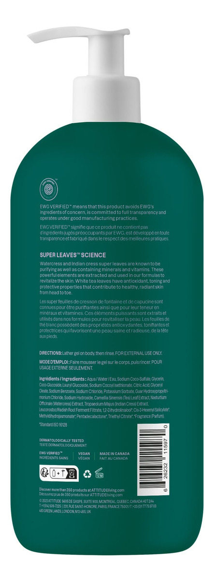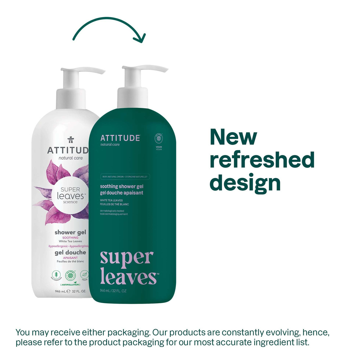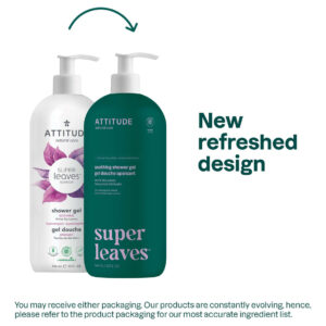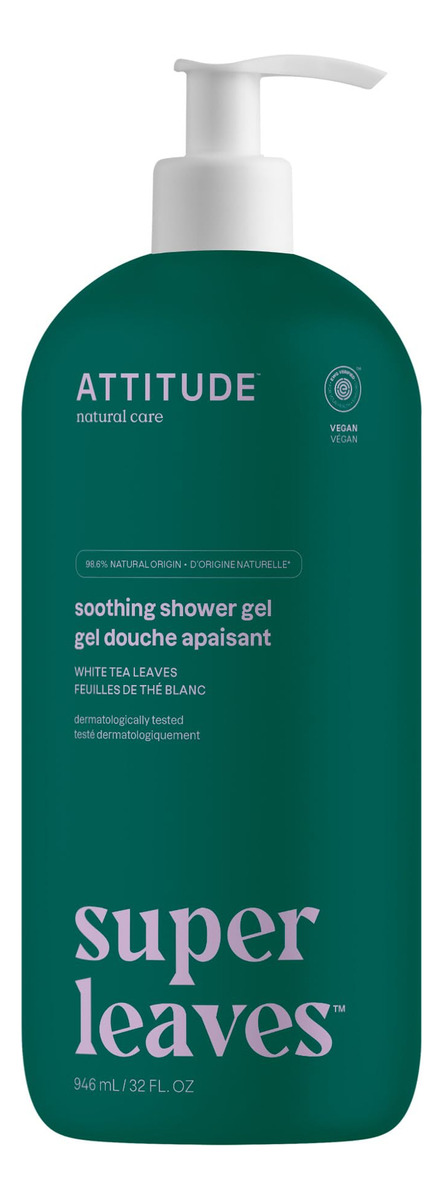 Gel de banho calmante ATTITUDE, testado dermatologicamente, à base de plantas e minerais, produtos veganos para cuidados pessoais, folhas de chá branco, 32 ml – VERIFICADO PELO EWG: ingredientes limpos e total transparência – INGREDIENTES DE ORIGEM NATURAL: Formulado com 98,7% de ingredientes de origem natural*, incluindo extrato de folhas de chá branco para ajudar a hidratar a pele e mantê-la macia e flexível – ALTO DESEMPENHO: enriquecido com agrião rico em minerais e agrião indiano com propriedades purificantes – TESTADO DERMATOLOGICAMENTE – VEGANO