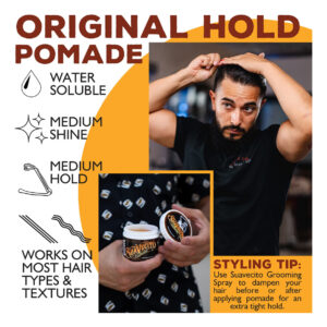 Nossas pomadas à base de água com cheiro incrível são feitas para manter o cabelo no lugar durante todo o dia e até a noite, se necessário. Eles se aplicam sem esforço com sua consistência cremosa e fornecem uma aderência forte para roupas lisas, pompadours, partes laterais ou qualquer penteado que você precise. Eles são lavados apenas com água e sem esforço extra, deixando seu cabelo com a mesma sensação de antes de você colocá-lo. – FIXAÇÃO ORIGINAL. RESISTÊNCIA MÉDIA. A Pomada Suavecito Original Hold seca com dureza média sem acabamento crocante. Obtenha a máxima flexibilidade de estilo, perfeita para cabelos curtos e longos. Depois de um longo dia, retoque seu estilo simplesmente adicionando água para reativar seu cão. – SOLÚVEL EM ÁGUA. A Pomada Suavecito Original Hold é o melhor produto para o cuidado do cabelo de alta qualidade, fixação média e solúvel em água. Ele agarra seu cabelo como cera, mas desbota como gel de cabelo. O complemento perfeito para qualquer kit de higiene, você obtém o melhor dos dois mundos. – PENTEIA FACILMENTE SEM DEIXAR RESÍDUOS BRANCOS. Esta pomada levemente perfumada penteia com facilidade e facilidade. Com um cheiro limpo e fresco, não haverá nenhum resíduo branco deixado para trás. Funciona perfeitamente nos estilos clássico, moderno, retrô e da velha escola para um look que dura o dia todo. – BRILHO MODERADO. Esta pomada de brilho moderado tem uma consistência cremosa fácil. Perfeito para todos, desde barbeiros e cabeleireiros profissionais até bartenders e garotos em movimento. Fique bem a qualquer hora do dia ou da noite.