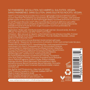 Gel espumante VERB Curl Mousse de controle de frizz para definição de cachos Produto capilar para realçar cachos Gel fixador de fixação média para ondas, cachos macios e bobinas, 6,7 fl oz – DEFINIÇÃO SEM CROCANTES: Um cruzamento entre uma mousse e um gel, este gel espumante de cachos fornece a definição profunda de um gel com o acabamento leve e sem crocantes de uma mousse. – RESTAURE + RETENHA: aumenta o cacho retenção de l em 20% * *resultados comprovados em um laboratório de testes terceirizado ao usar a coleção completa da Verb Curl – RESULTADOS COMPROVADOS: reduz o frizz em até 84% após apenas um uso* *resultados comprovados em um terceiro- laboratório de testes para festas ao usar a coleção Verb Curl completa – PRINCIPAIS INGREDIENTES: Alimentado por nosso complexo exclusivo SunflowerCurl, óleo de jojoba e óleo de rícino, este gel espumante Curl promove a retenção de cachos e fornece umidade leve para cachos elásticos. – SOMENTE AS COISAS BOAS: nosso gel espumante Curl, junto com toda a coleção Verb Curl, é sem parabenos, sem sulfato, sem silicone e sem glúten livre de crueldade, vegano e certificado pela PETA.