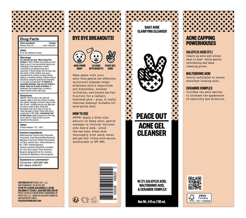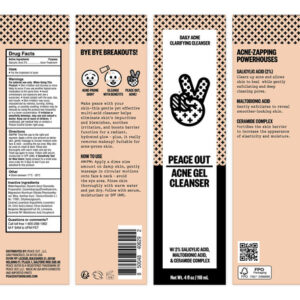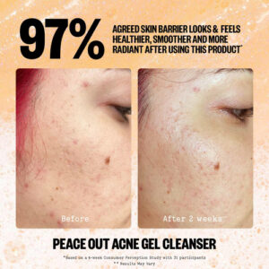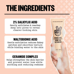 – Peace Out Skincare Acne Gel Cleanser: um poderoso limpador facial diário que combina ácido salicílico e ácido maltobiônico para limpar profundamente, esfoliar e reduzir a aparência de manchas. Atua com eficácia contra a acne no rosto e nas costas, deixando a pele fresca e