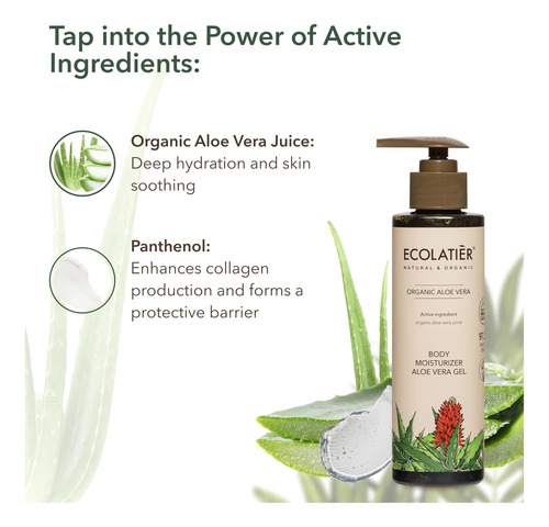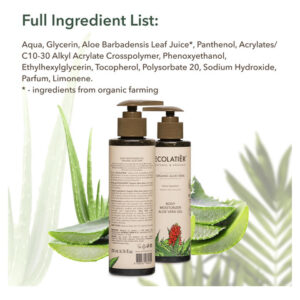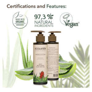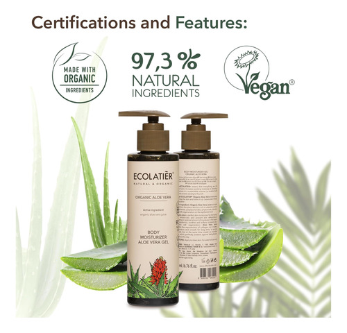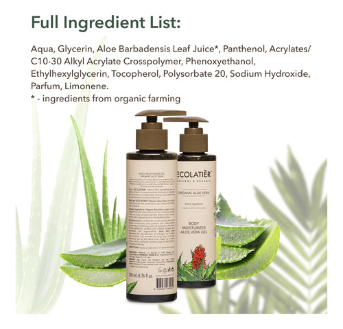 [longdescription] • gel de aloe vera orgânico para rosto e corpo, enriquecido com vitaminas, hidrata profundamente e suaviza a pele seca enquanto formava uma barreira invisível para proteger contra a desidratação. • O gel puro de aloe vera absorve rapidamente, criando uma textura firme e suave. Perfeito para uso como hidratante no chuveiro ou um hidratante leve para o rosto para hidratação de longa duração. • Gel de aloe vera orgânico amigável para viagens, projetado para a pele seca e as necessidades diárias de hidratação. O gel natural de Aloe Vera acalma e protege a pele irritada ou queimada pelo sol. • Loção corporal nutritiva e hidratante em gel em um. Nossa fórmula vegana com ingredientes orgânicos é segura para todos os tipos de pele e deixa a pele macia e atualizada. • Gel de aloe vera com ingredientes sem preocupações e um acabamento não grave. Ideal como um gel calmante Aloe Vera para alívio de queimaduras solares, perfeito para uso após o banho. Color: Marca: ECOLATIÈR Dimensiones: 0.042 x 0.19 x 0.055 mts Peso del Producto: 0.245 Kilogramos. Peso de Envio: 0.245 Kilogramos. Modelo: B0CJPMF3X2 Garantia do vendedor: 30 dias