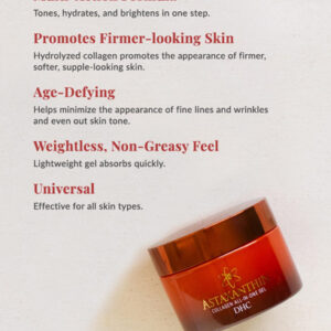 Gel tudo-em-um de colágeno de astaxantina DHC, hidratante facial diurno iluminador, leve, tonificante, hidratante, de absorção rápida, sem colágeno, fragrância e corantes, ideal para todos os tipos de pele – Hidratante em gel leve e de rápida absorção – Tonifica, hidrata e ilumina em uma única etapa – Formulado com astaxantina, geleia real e colágeno hidrolisado – Ajuda a proteger contra radicais livres e estressores ambientais – reduz visivelmente a aparência de linhas finas e rugas