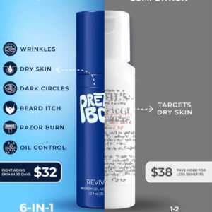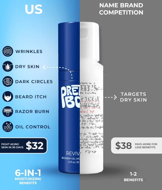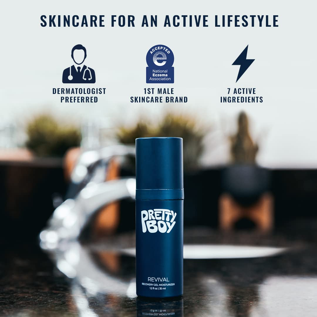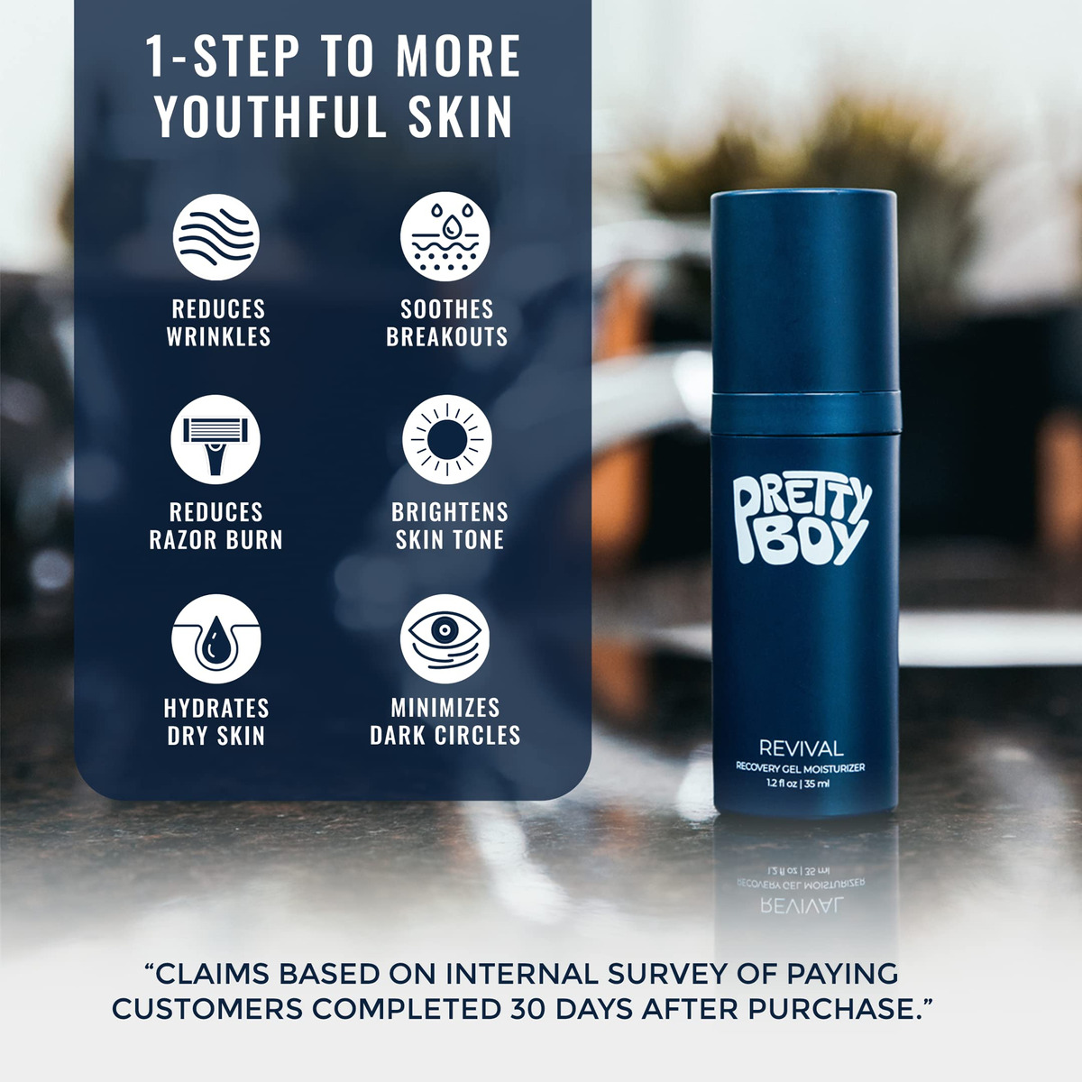 Hidratante em gel PrettyBoy Face Revival para homens — Creme hidratante que refresca a pele seca, irritação e vermelhidão — Suporta antienvelhecimento e antirrugas — Sem perfume — 1 unidade — PARA ESTILOS DE VIDA ATIVOS: Nosso creme em gel é o companheiro perfeito para cuidados com a pele para pessoas com estilos de vida ativos. Se você está indo para a academia, curtindo aventuras ao ar livre ou em constante movimento, nossa fórmula leve garante que sua pele permaneça bem hidratada sem se sentir pesada ou oleosa. Ele não apenas fornece a umidade essencial de que sua pele precisa, mas também deixa seu rosto incrivelmente limpo, permitindo que você mantenha seu ritmo ativo sem nenhum desconforto ou distração. – SETE INGREDIENTES ATIVOS: Escolhemos ingredientes recomendados por dermatologistas, como 2% de niacinamida e 2% de ácido hialurônico, que beneficiam sua pele ao reter umidade e hidratar, fortalecer a pele e evitar toxinas. Obtenha uma aparência fresca e confiante com uma pele bem hidratada e revitalizada. Tenha a melhor aparência e se sinta bem com o PrettyBoy. — Absorve imediatamente: a textura leve exclusiva do PrettyBoy é habilmente criada para oferecer absorção imediata, garantindo que ela se funda facilmente à sua pele. Isso significa que você pode desfrutar de hidratação contínua ao longo do dia, sem a inconveniência de um tom branco ou daquele incômodo resíduo oleoso que muitos outros hidratantes deixam para trás. Sua pele permanece confortavelmente nutrida e refrescada da manhã até a noite, para que você possa enfrentar o dia com confiança. – Ótimo para peles sensíveis: ótimo para peles sensíveis: adequado para peles sensíveis, incluindo aquelas com eczema. Revival é o primeiro hidratante masculino a receber o selo de aceitação da National Eczema Association. Diga adeus à irritação e vermelhidão da pele. PrettyBoy é suave para a pele e ajuda a aliviar e acalmar qualquer desconforto. – COMO USAR: Aplique de 1 a 2 bombas uniformemente no rosto e pescoço na pele recém-limpa. Recomendamos de manhã e à noite – ou sempre que seu rosto precisar de um impulso. O Revival é tão versátil quanto você. Sinta-se à vontade para usá-lo sempre que seu rosto exigir um impulso, seja depois de um treino ou de um longo dia no escritório!