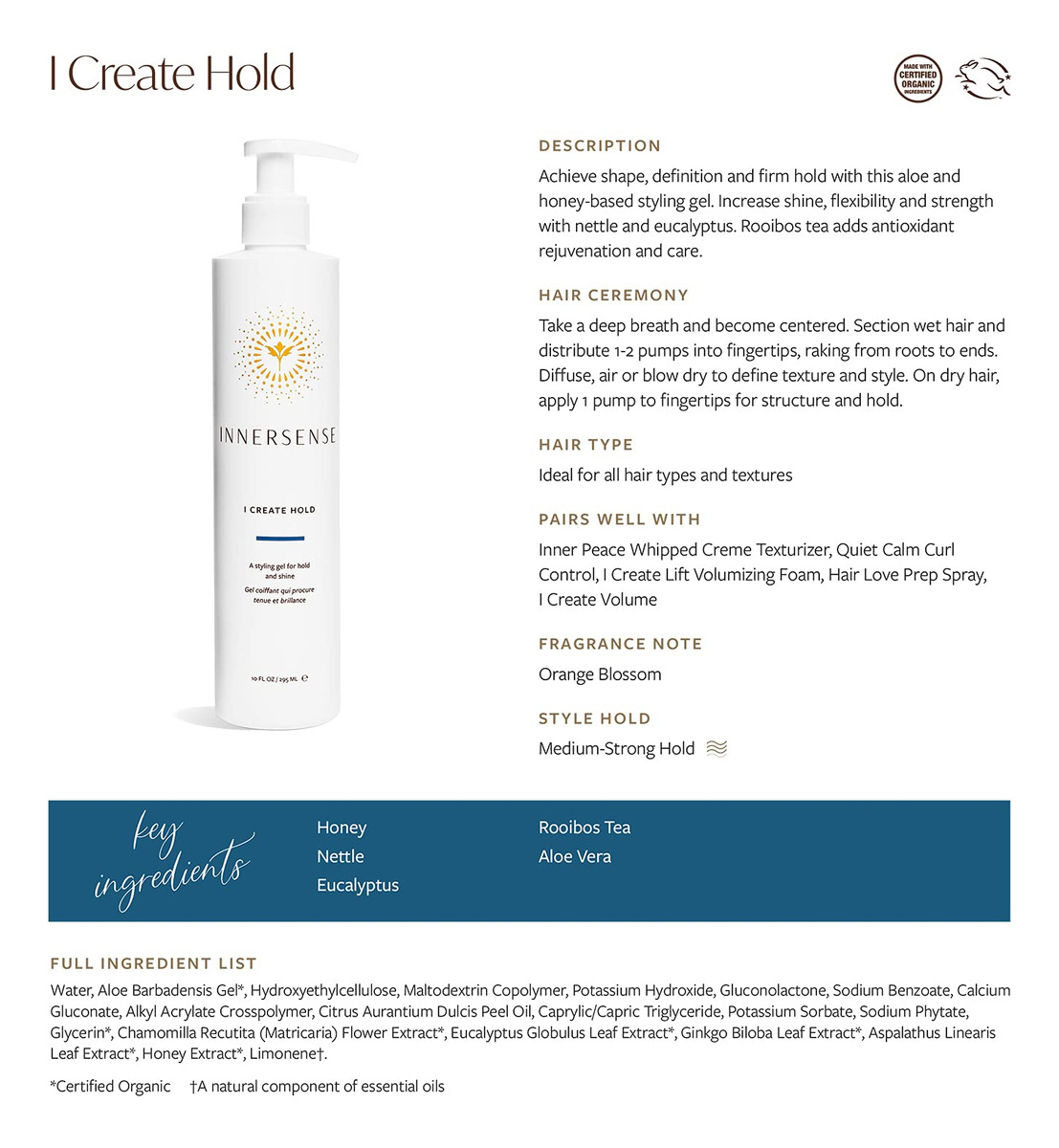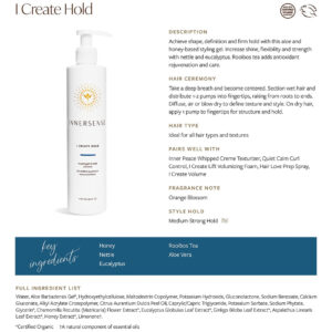 Eu sou radiante! Style Control Organic Trade Association Feito com ingredientes orgânicos certificados Mel orgânico certificado, chá Rooibos e Aloe adicionam antioxidantes protetores, hidratação e retenção aprimorada para o dia todo. I Create Hold dá ao seu estilo uma fixação e brilho gerenciáveis da raiz às pontas. O mel orgânico certificado atua como uma resina natural para criar fixação e brilho. O chá Rooibos orgânico adiciona proteção antioxidante. Os extratos de urtiga e alecrim se combinam para adicionar brilho e brilho incríveis aos cabelos. Use no cabelo molhado, depois seque e modele para finalizar. Todos os produtos Innersense contêm ingredientes orgânicos vitais conhecidos por seus benefícios nutritivos, calmantes e antioxidantes. – Um gel modelador natural para segurar e brilhar – Obtenha forma, definição e fixação firme com este gel modelador à base de aloe e mel, ideal para todos os tipos de cabelo e texturas – Aumente o brilho, a flexibilidade e a força com urtiga e eucalipto, enquanto o chá Rooibos adiciona rejuvenescimento antioxidante e cuidado – Ingredientes diretamente da natureza, cultivados organicamente + Sustentavelmente sem produtos químicos – Colhidos eticamente + Provenientes de plantações e pomares confiáveis e transparentes + Fazendas de todo o mundo – sem parabenos, sem sulfato, sem glúten, sem crueldade