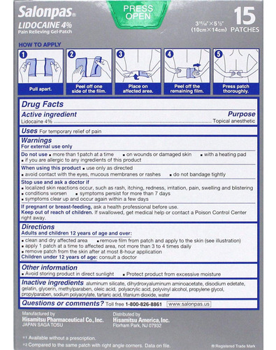 FRETE GRÁTIS - Enviado pelos Correios. Entrega em até 7 dias.Patch de gel de lidocaína Salonpas (15 unidades) (pacote com 2)