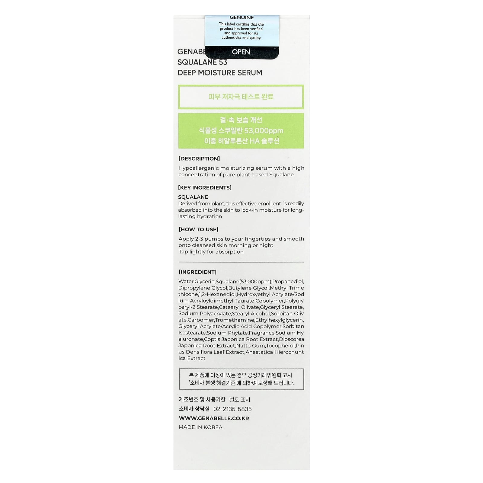 Genabelle Sérum de Hidratação Profunda com Esqualano 30 ml (101 fl oz) – Genabelle Beleza Tratamentos e Séruns Séruns Faciais Tratamentos e Séruns K-Beauty.