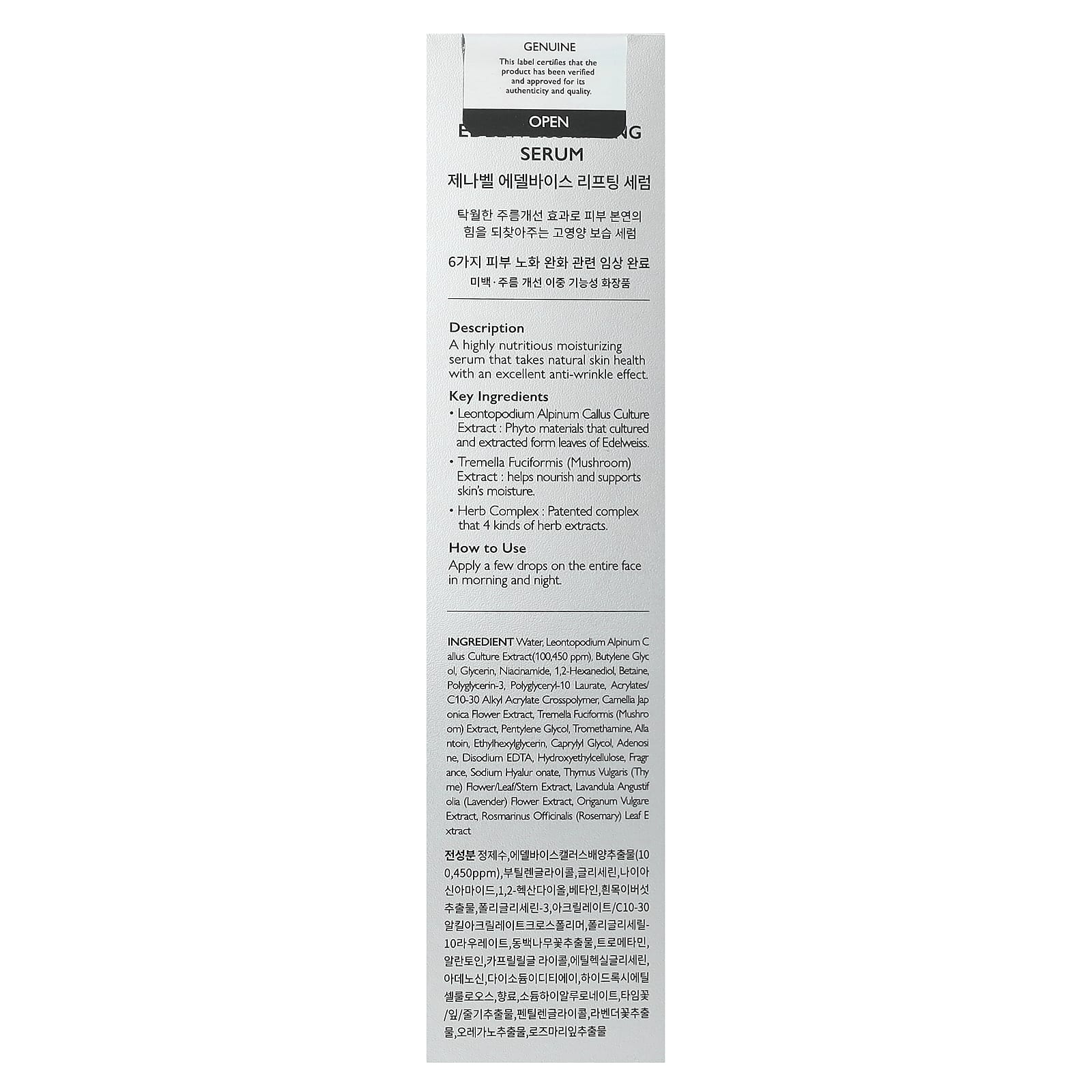 Água, extrato da cultura de Leontopodium alpinum ceallus (100.450 ppm), butilenoglicol, glicerina, nicotinamida, 1,2-hexanediol, betaína, polyglycerin-3, laurato de poliglicerila 10, acrylates/ c10-30 alkyl acrylate crosspolymer, extrato da flor de Camellia japonica, extrato de Tremella fuciformis (cogumelo), pentilenoglicol, trometamol, alantoína, ethylhexylglycerin, caprylyl glycol, adenosina, edetato dissódico, hietelose, fragrância, hialuronato de sódio, extrato da flor/folha/caule de Thymus vulgaris (tomilho), extrato da flor de Lavandula angustifolia (lavanda), extrato de Origanum vulgare, extrato da folha de Rosmarinus officinalis (alecrim).