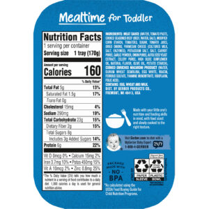 Molho de carne (água, pasta de tomate, carne cozida e temperada (carne bovina, água, sal), amido de milho modificado, tomates, açúcar, suco de tomate, cebolas secas, queijo parmesão (leite de cultura, sal, enzimas), sal de potássio, sal, purê de cenoura, alho em pó, purê de cebola, extrato de levedura autolisada, purê de aipo, óleo de girassol com alto teor oleico, sabor natural, óleo de oliva, fécula de batata), macarrão enriquecido cozido (água, sêmola de trigo duro, clara de ovo, ácido nicotínico, sulfato ferroso, nitrato de tiamina, riboflavina, ácido fólico).