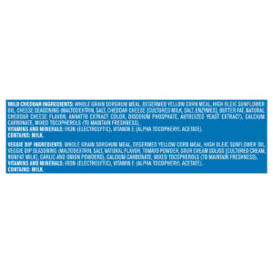 Ingredientes do cheddar leve: farinha de sorgo integral, fubá de milho amarelo degermado, óleo de girassol com alto teor oleico, tempero de queijo (maltodextrina, sal, queijo cheddar [leite de cultura, sal, enzimas], manteiga, sabor natural de queijo cheddar, extrato de urucum corante, fosfato dissódico, extrato de levedura autolisada), carbonato de cálcio, tocoferóis mistos (para preservar o frescor), vitaminas e minerais: ferro (eletrolítico), vitamina E (como acetato de racealfatocoferol).