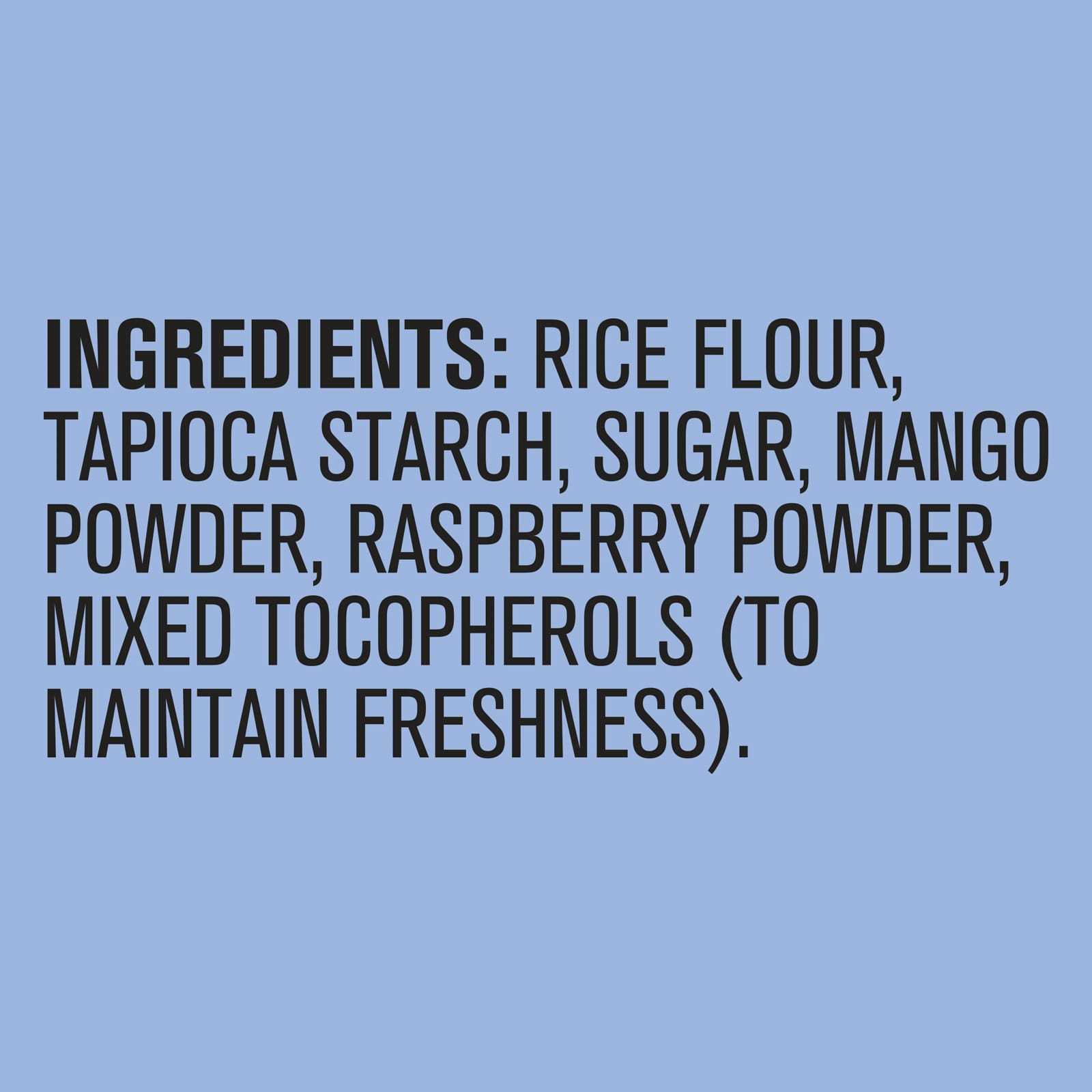Farinha de arroz, amido de tapioca, açúcar, manga em pó, pó de framboesa, tocoferóis mistos (para preservar o frescor).