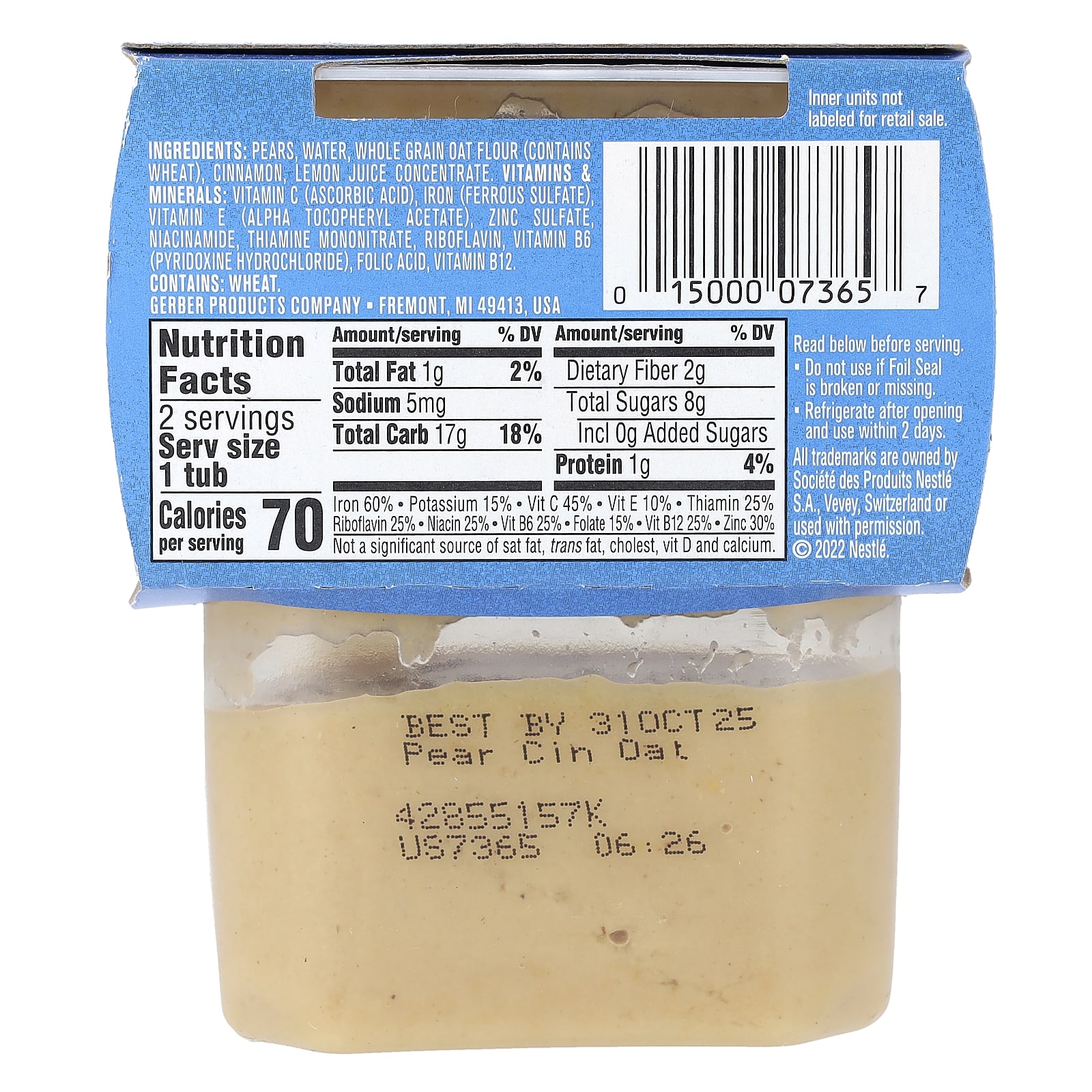 Peras, água, farinha de aveia integral (contém trigo), canela, suco concentrado de limão. vitaminas e suplementos; minerais: vitamina C (ácido ascórbico), ferro (sulfato ferroso) vitamina E (acetato de racealfatocoferol), sulfato de zinco e nicotinamida, mononitrato de tiamina, riboflavina, vitamina B6 (cloridrato de piridoxina), ácido fólico, vitamina B12.