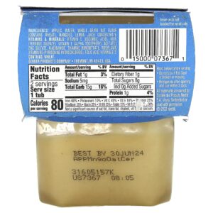 Maçãs, suco de maçã (água, aplique suco concentrado), farinha de arroz integral, purê de manga (água, concentrado de purê de manga), farinha de arroz, suco concentrado de maçã, citric acid.
