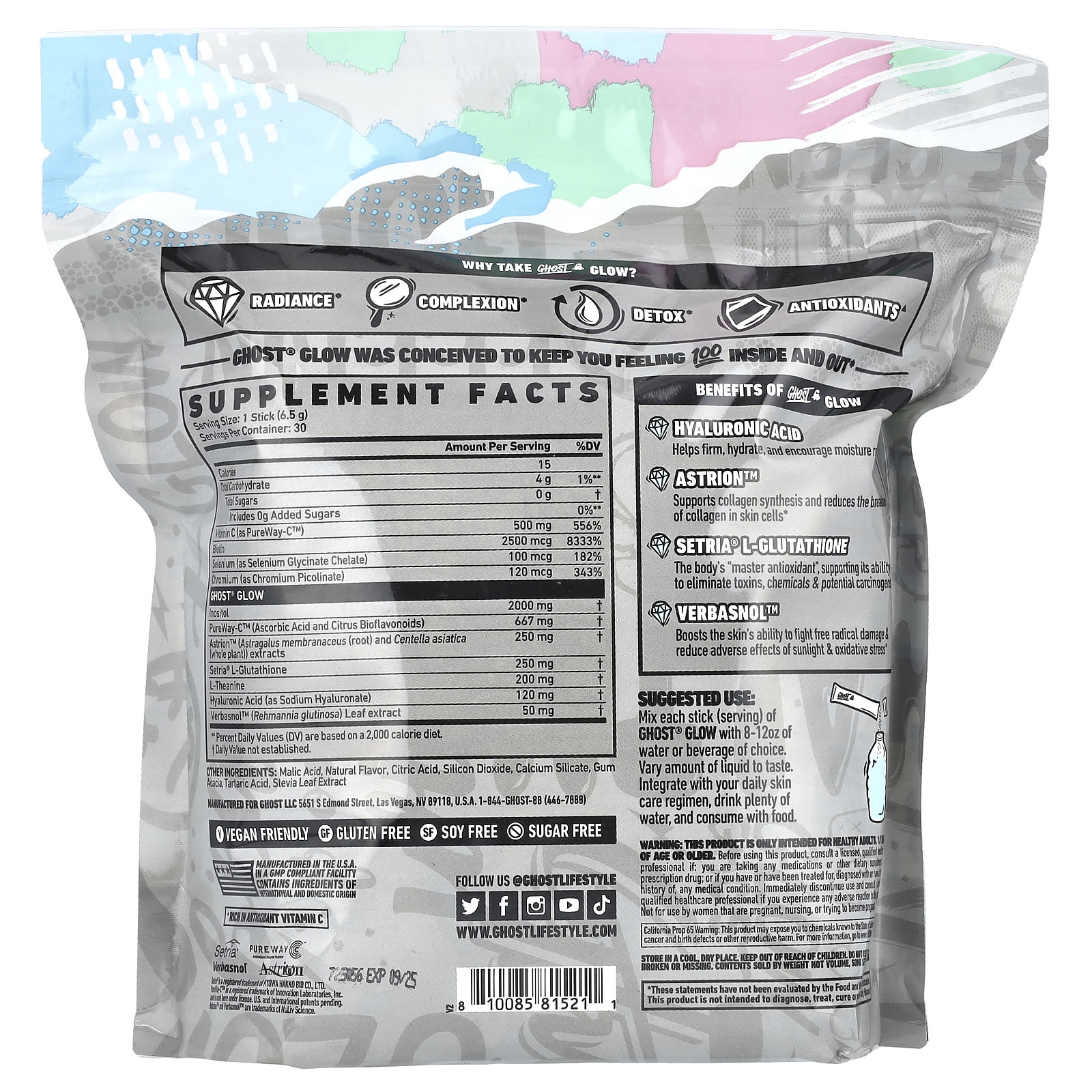 Misture cada bastão (porção) de GHOST® GLOW com 8 a 12 oz de água ou bebida de sua escolha. Variar a quantidade de líquido a gosto. Integre sua rotina de cuidados diários com a pele, beba bastante água e consuma com alimentos.