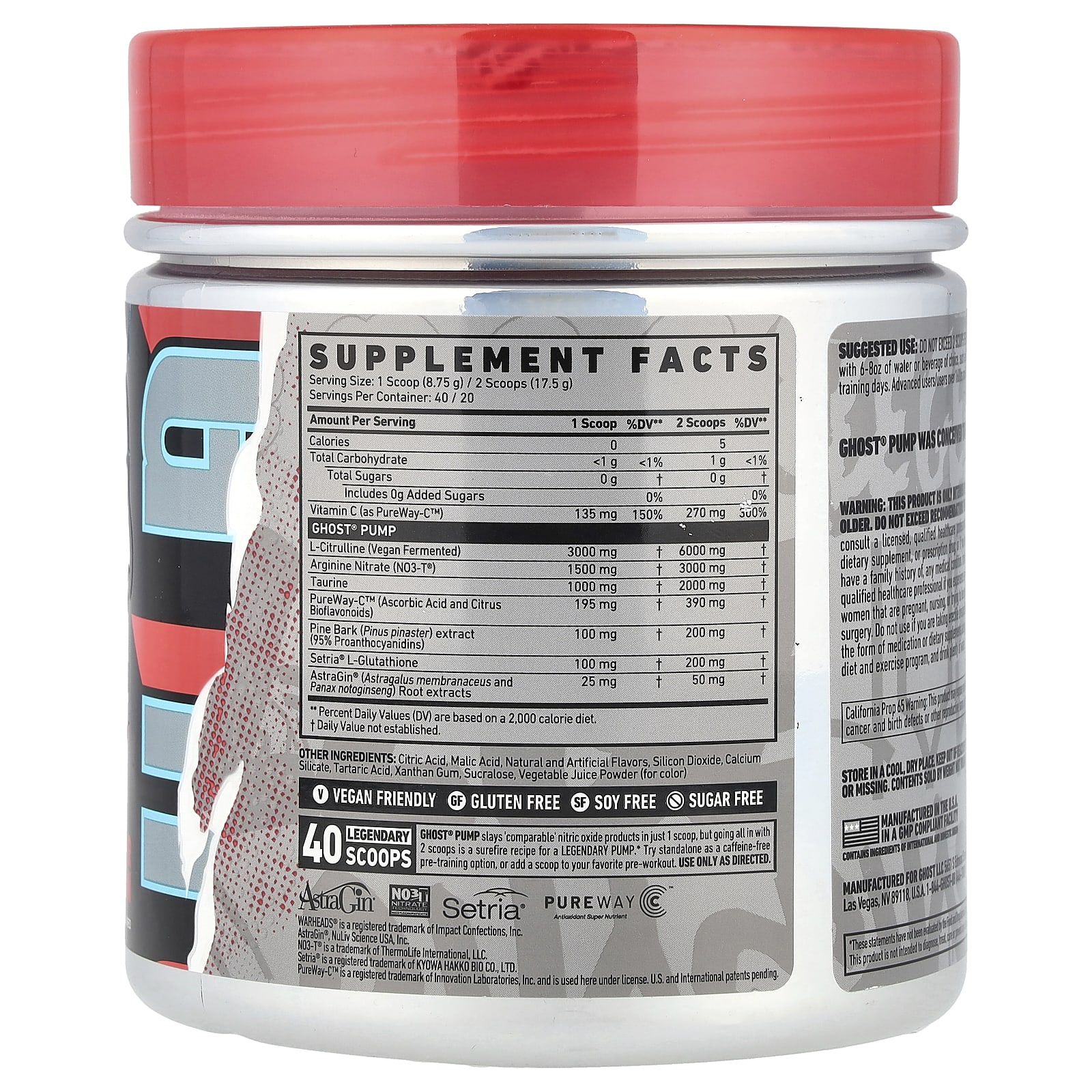 O GHOST® PUMP eleva ainda mais os padrões dos ingredientes que todos amamos… L-Citrulina (Fermentada Vegana), Nitrato de Arginina NO3-T® (um ingrediente patenteado que realmente achamos que é o melhor de todos) e algumas inclusões incríveis (Setria® e PureWay-C™), além de estar em alguns de nossos produtos GHOST favoritos sabores ®.