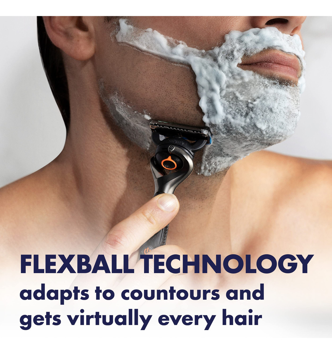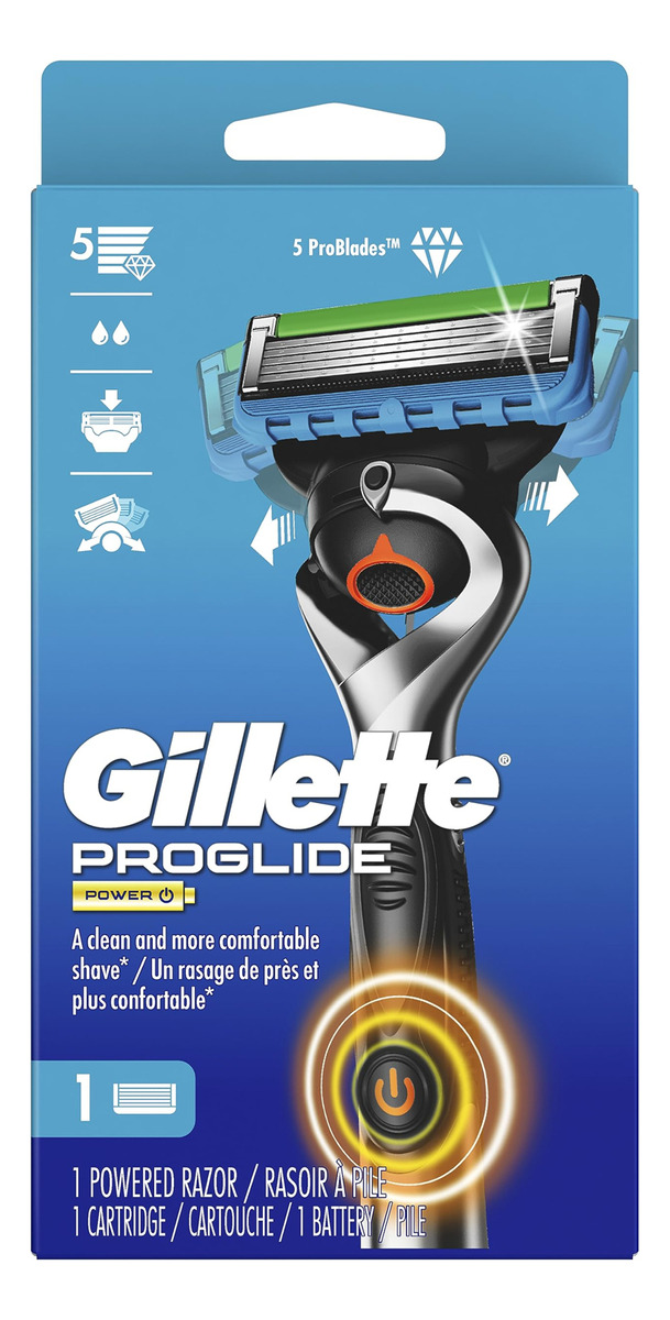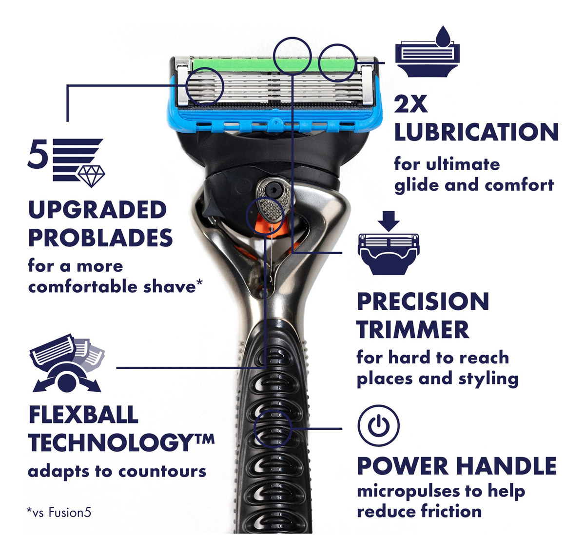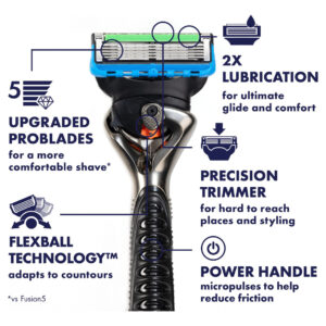The Gillette ProGlide Power mens razor with FlexBall technology responds to your contours giving you uncompromising closeness and comfort. This power razor features battery-powered soothing micropulses that help you to reduce friction so the 5 antifriction blades glide smoothly over your skin for a shave you can barely feel. The blades are spaced closely together for incredible comfort with a precision trimmer on the back for hard-to-reach places and for styling your facial hair just the way you want it. The enhanced lubrastrip (vs. Fusion5) has more lubricants for comfort and glide. Soft microfins gently stretch and smooth your skin while a microcomb helps guide your hair for a close shave from our thinnest blades. One razor blade refill lasts up to one month of shaves. The ProGlide Power handle can fit all Gillette 5-blade razor refills (excluding GilletteLabs).