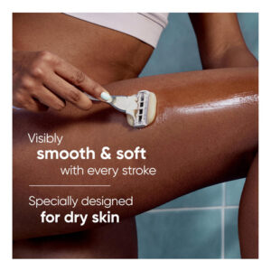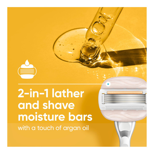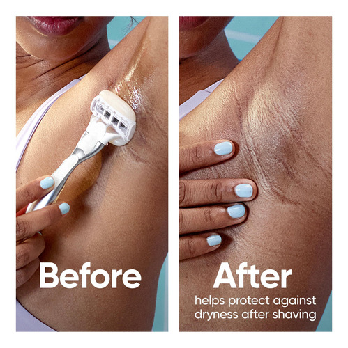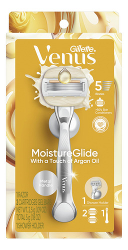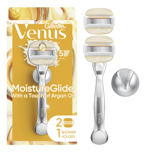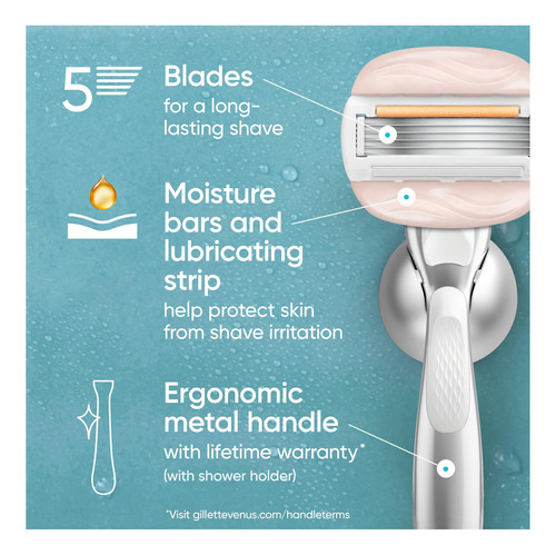 Barbeador feminino Venus Moistureglide, cabo reutilizável, 2 recargas de lâmina de barbear e suporte de banho — BARRAS DE GEL DE BARBEAR 2 EM 1: A lâmina de barbear feminina Venus Moistureglide ensaboa e barbeia, revelando uma pele visivelmente macia e hidratada sem creme de barbear. — Projetada para pele seca: a faixa lubrificante desliza sobre a pele para fornecer 50% mais proteção contra irritações de barbear — Lâmina de barbear de 5 lâminas: Lâminas ultra afiadas para uma pele visivelmente lisa e macia a cada pincelada. Cada recarga dura até 30 dias com base em 2 vezes por semana de barbear — Alça de metal durável: pesada para controle, essa alça reutilizável funciona com qualquer recarga de lâmina Venus — CONFIADA POR ESPECIALISTAS EM PELES SENSÍVEIS: credenciada pela Skin Health Alliance