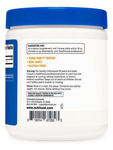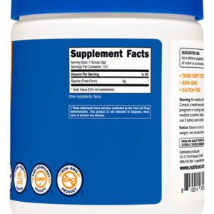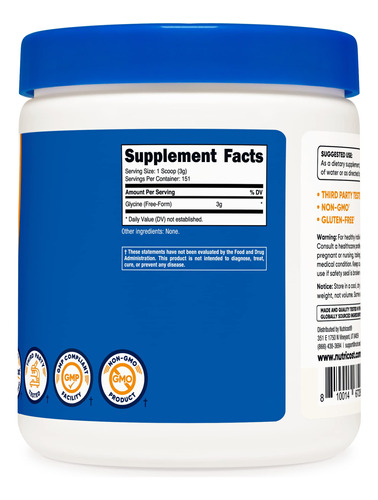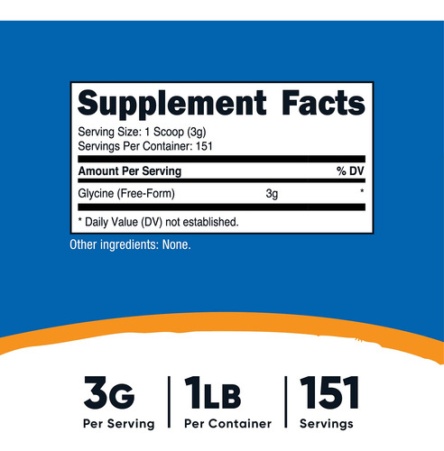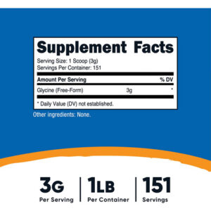 O pó Nutricost Glycine contém 1 libra de glicina em cada frasco. Cada porção contém 3g de glicina de forma livre (uma conveniente colher de porção incluída). Não é transgênico, sem glúten e testado por terceiros. – 1 libra (16 onças/454 g) de glicina em pó por recipiente – Inclui uma colher de servir conveniente – Suprimento para 5 meses, se tomado conforme sugerido – Sem transgênicos e sem glúten – Fabricado em uma instalação compatível com GMP e registrada pela FDA