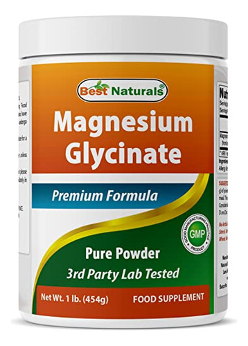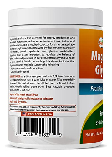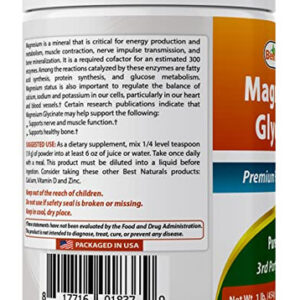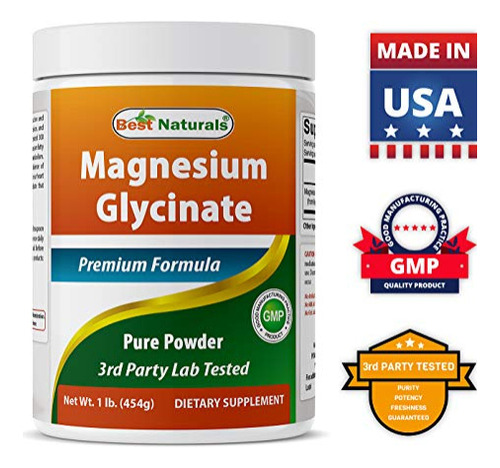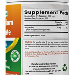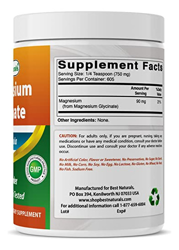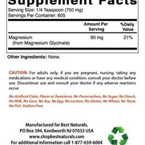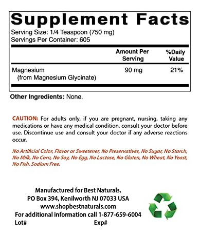 Best Naturals Magnesium Glycinate 1 Lb Pure Powder – 3rd Party Lab Tested for Purity & Quality. – Teaspoon (750 mg) of Magnesium Glycinate per Serving, 605 Servings per bottle. – Non-GMO & Gluten-Free. – Proudly Made in USA, GMP Compliant, FDA Registered Facility. – No Artificial Color, Flavor, or Sweetener, No Preservatives, No Sugar, No Milk, No Corn, No Soy, No Egg, No Lactose, No Gluten, No Wheat, No Yeast, No Fish. Sodium Free.
