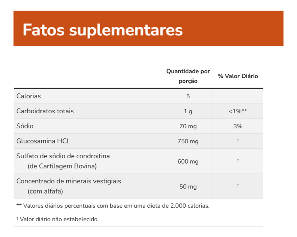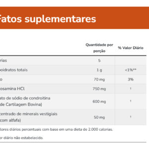 1 g carbohidratos, 400 mg concentrado de minerales traza, 5 kcal calorías, 55 mg sodio, 600 mg sulfato de condroitina sódica, 750 mg clorhidrato de glucosamina
