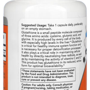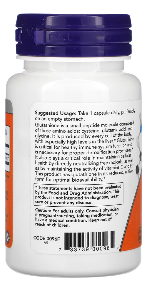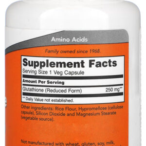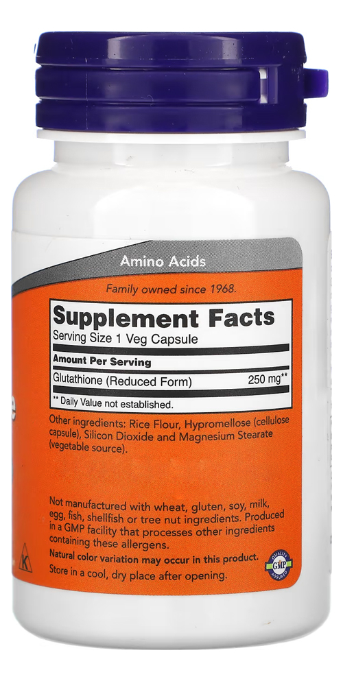 A glutationa é uma substância fundamental para o funcionamento regular do sistema imune e também é necessária para os processos de desintoxicação, bem como ainda atua no combate aos radicais livres; Disponível em fórmula de 250mg, com cápsulas vegetarianas de fácil ingestão e absorção, esta fórmula desenvolvida pela Now pode ser facilmente utilizada para complementar sua dieta alimentar com as quantidades necessárias dessa substância;