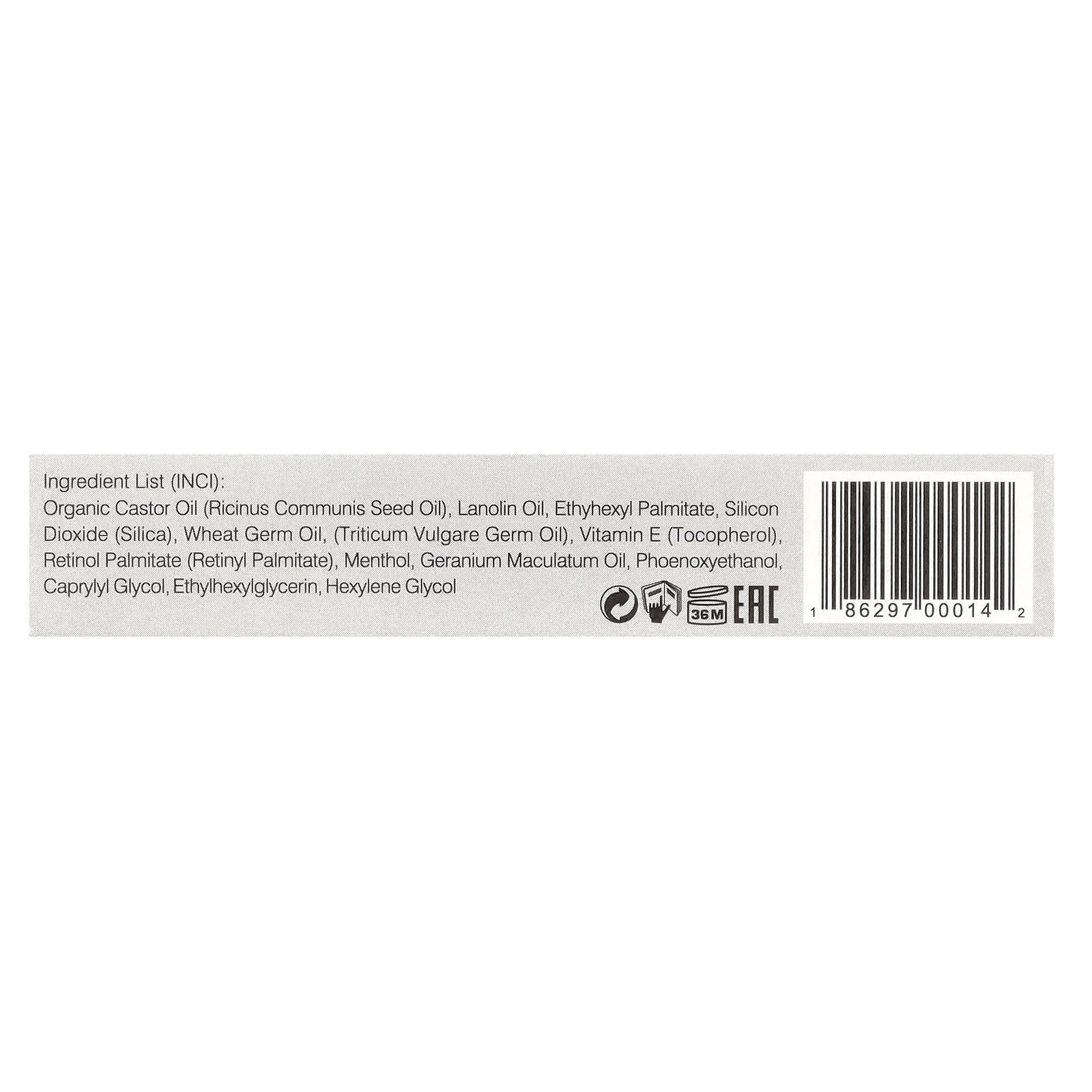 Óleo de rícino orgânico (óleo da semente de Ricinus communis), óleo de lanolina, ethylhexyl palmitate, dióxido de silício (sílica), óleo do germe do trigo, (óleo do germe de Triticum vulgare), vitamina E (tocoferol), palmitato de retinol (palmitato de retinol), mentol, óleo de Geranium maculatum, fenoxietanol, caprylyl glycol, ethylhexylglycerin, hexylene glycol.