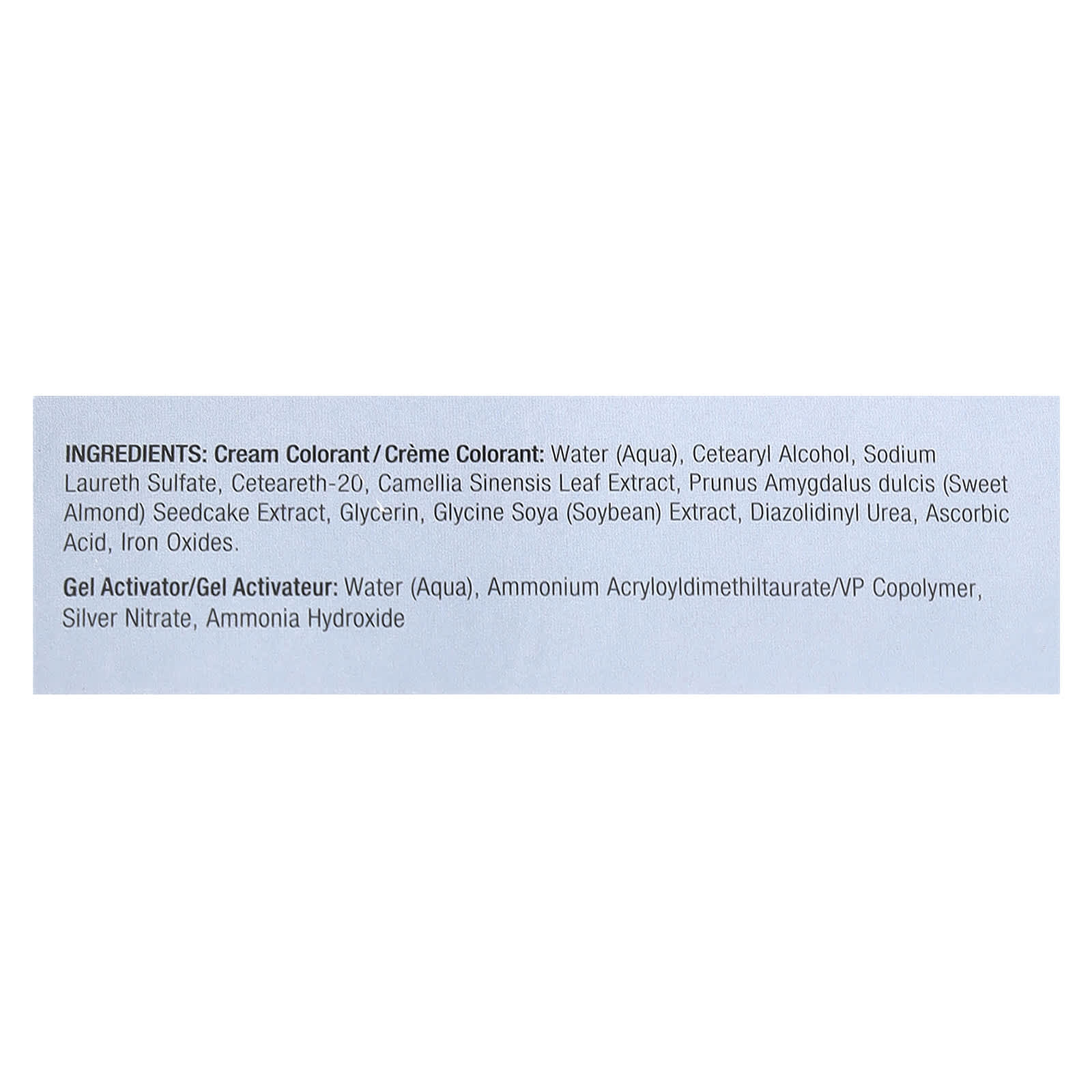 Corante Creme: Corante creme/corante creme: água (aqua), álcool cetoestearílico, lauriletersulfato de sódio, ceteareth-20, extrato da folha de Camellia sinensis, extrato da semente de Prunus amygdalus dulcis (amêndoa doce), glicerina, extrato de Glycine soja (soja), diazolidinyl urea, ácido ascórbico, óxidos de ferro.