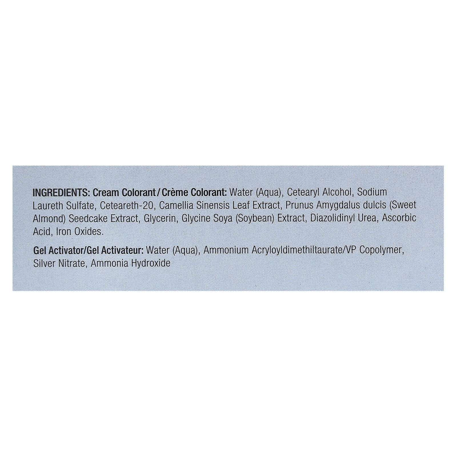 Corante creme: água, álcool, denat, cerne de Acacia catechu / parte aérea de Achillea millefolium / noz de Aesculus hippocastanum / flor de Calendula officinalis / folha de Camellia sinensis / flor de Carthamus tinctorius / raiz de Dichroa febrifuga lour / Galla chinensis cecidium / Hypericum perforatum inteiro / folha de Juglans regia hullago erva virgaurea / folha de Urtica dioica / fruta Vaccinium myrtillus / fruta Vitex agnus-castus / extrato da semente de vitis vinifera, carbômero, hidróxido de sódio. Pode conter pirogalol.
