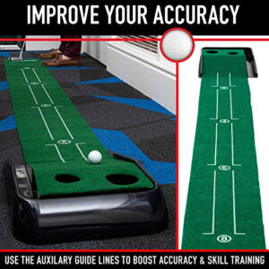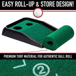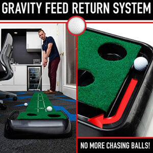 A prática leva à perfeição Sem necessidade de baterias O Franklin Indoor Golf Putting Green com retorno de bola alimentado por gravidade pode ser usado em ambientes internos ou externos. Essa ferramenta de treinamento é ótima para todos os níveis de jogo. Chega de perseguir suas bolas ou se curvar para pegá-las. A relva de estilo autêntico oferece uma excelente superfície para praticar suas tacadas. Economize tempo e dinheiro. Esse auxiliar de treinamento também permitirá que você faça mais tacadas com menos esforço, melhorando seu jogo curto.