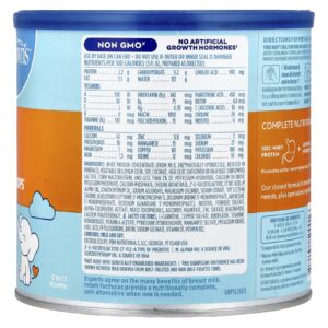 Concentrado de proteína whey (de leite, hidrolisado enzimaticamente, reduzido em minerais), óleos vegetais (oleína de palma, soja, coco, cártamo com alto teor oleico ou girassol com alto teor oleico), lactose, maltodextrina de milho, e menos de 2% de: hidróxido de potássio, cloreto de cálcio, fosfato de potássio, fosfato de cálcio, hemitartarato de colina, 2′-0-fucosilactose, ácido cítrico, m. óleo de alpina, óleo de schizochytrium, ascorbato de sódio, cloreto de magnésio, citrato de sódio, lecitina de soja, taurina, nucleotídeos (citidina 5′ monofosfato, uridina 5′ monofosfato dissódico, adenosina 5′ monofosfato, guanosina 5′ monofosfato dissódico), inositol, sulfato ferroso, acetato de racealfatocoferol, tocoferóis mistos, palmitato de ascorbila, sulfato de zinco, nicotinamida, pantotenato de cálcio, b. culturas de lactis, l-carnitina, sulfato de cobre, riboflavina, mononitrato de tiamina, acetato de vitamina A, cloridrato de piridoxina, sulfato de manganês, iodeto de potássio, ácido fólico, filoquinona, biotina, selenato de sódio, vitamina D3, vitamina B12.