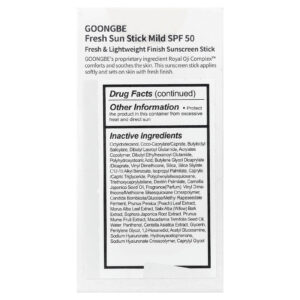 O ingrediente patenteado Royal Oji Complex™ da GOongBe conforta e acalma a pele. Este protetor solar em bastão é aplicado suavemente e age na pele com um acabamento refrescante.