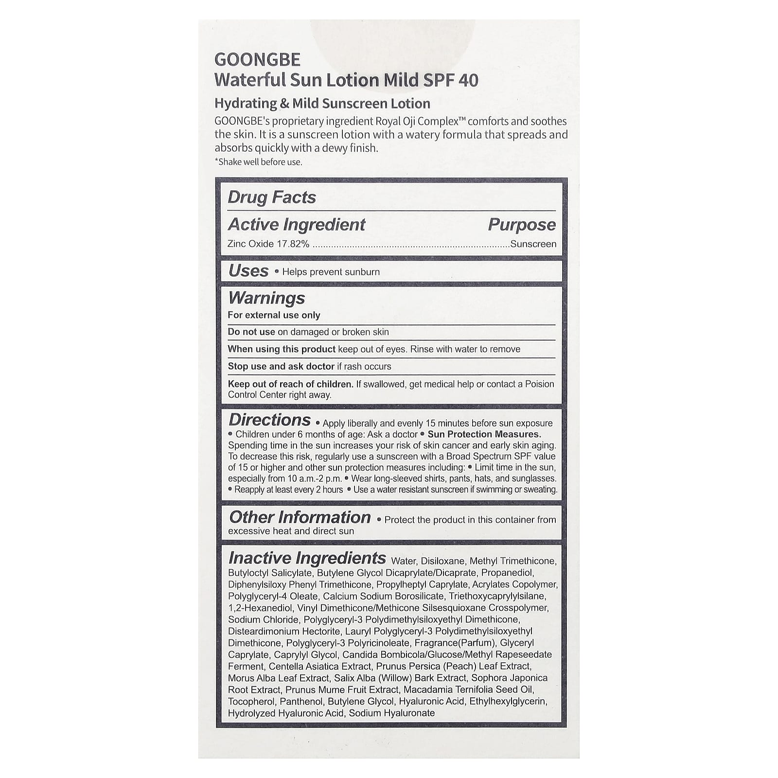 O ingrediente patenteado Royal Oji Complex™ da GOongBe conforta e acalma a pele. É uma loção protetor solar com fórmula aquosa que se espalha e é rapidamente absorvida com um acabamento orvalhado.