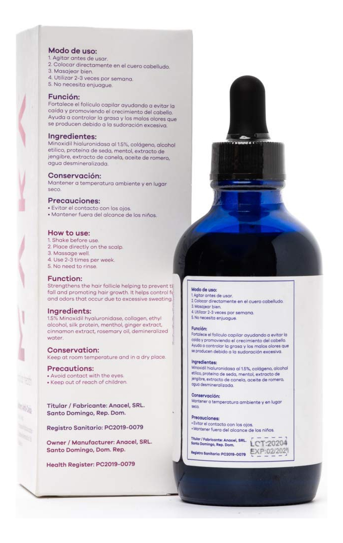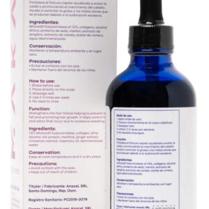 Funciona estimulando o crescimento, evitando a perda de cabelo e fortalecendo o folículo piloso. Para usá-lo, divida o cabelo em mechas, aplique diretamente no couro cabeludo, gota a gota, e massageie com a ponta dos dedos. É importante fazer a massagem a partir do momento em que é aplicada no couro cabeludo para que o produto penetre e, assim, evite que escorra sobre o fio. Pode ser usado com cabelos secos ou molhados. Aplique pelo menos duas vezes por semana. – Estimulante capilar – Dê força extra ao couro cabeludo e pare de recuar a linha do cabelo. Recupere novos cabelos restaurando os folículos capilares secos e permitindo que cresçam novos cabelos mais cheios e com aparência mais jovem – Agradavelmente perfumado e não oleoso – Este produto para o cuidado do cabelo inclui uma mistura de gengibre, alecrim e canela para que você possa desfrutar de sua aplicação sem a experiência desconfortável proporcionada por outros produtos oleosos do mercado. – Para todos os tipos de cabelo – Independentemente do tipo de cabelo, este tratamento é perfeito para uso na estágios iniciais de queda de cabelo e para ajudar a manter sua densidade. – Ingredientes naturais – Com alecrim, canela, mentol e outros ingredientes especiais para nutrir os folículos capilares e ajudar a manter um couro cabeludo saudável com uma experiência agradável de uso. – Não é necessário usar todos os dias – Use no máximo três vezes por semana para mulheres. Pode ser usado todos os dias para homens. Solução tópica fácil de aplicar, para se adequar perfeitamente à sua rotina diária.