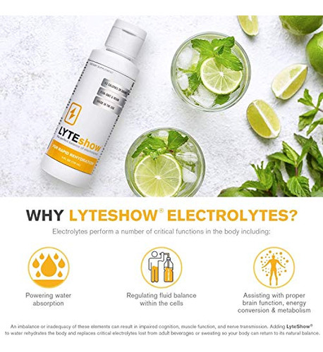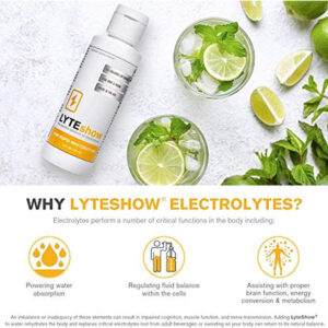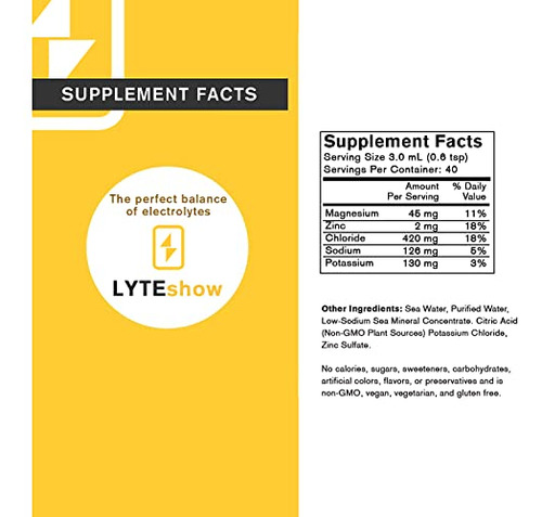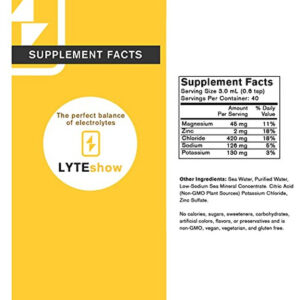 Fatos sobre o suplemento para uma porção de LyteShow: Porção de 3,0 mL (0,6 colher de chá) /Porções por embalagem: 50. Magnésio: 40 mg (10% D.V.). Sódio: 125 mg (5% D.V.). Zinco: 2 mg (10% D.V.). Cloreto: 390 mg (10% D.V.). Potássio: 130 mg (4% D.V.). Sulfato: 20mg. Veja as fotos do frasco para ver as especificações completas do produto.