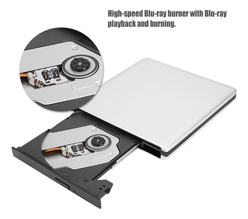 Feito de liga de alumínio, forte e durável. Gravador de Blu-ray de alta velocidade com reprodução e gravação de Blu-ray. Suporte para reprodução e gravação de filmes em Blu-ray 3D. Compatível com desktop, notebook e multifuncional. Os quatro cantos são equipados com um design de pedal para garantir a operação suave da unidade óptica. Especificação: Características: Feito de liga de alumínio, forte e durável. Gravador de Blu-ray de alta velocidade com reprodução e gravação de Blu-ray. Suporte para