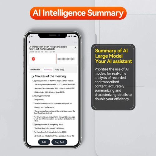 Gravador inteligente com transcrição por IA, resumo inteligente, função de conversão de áudio em texto, redução de ruído, áudio de alta qualidade, motor de processamento de voz poderoso, compatível com 58 idiomas. Transcrição eficiente (geralmente concluída em 2 minutos), alta precisão (acima de 92%).
