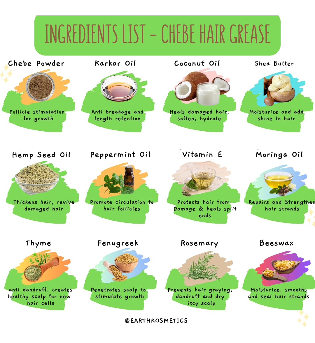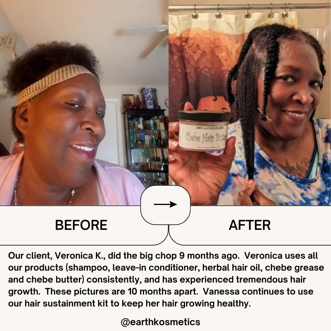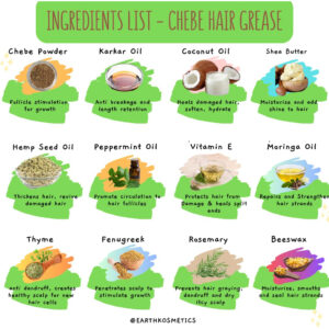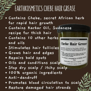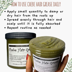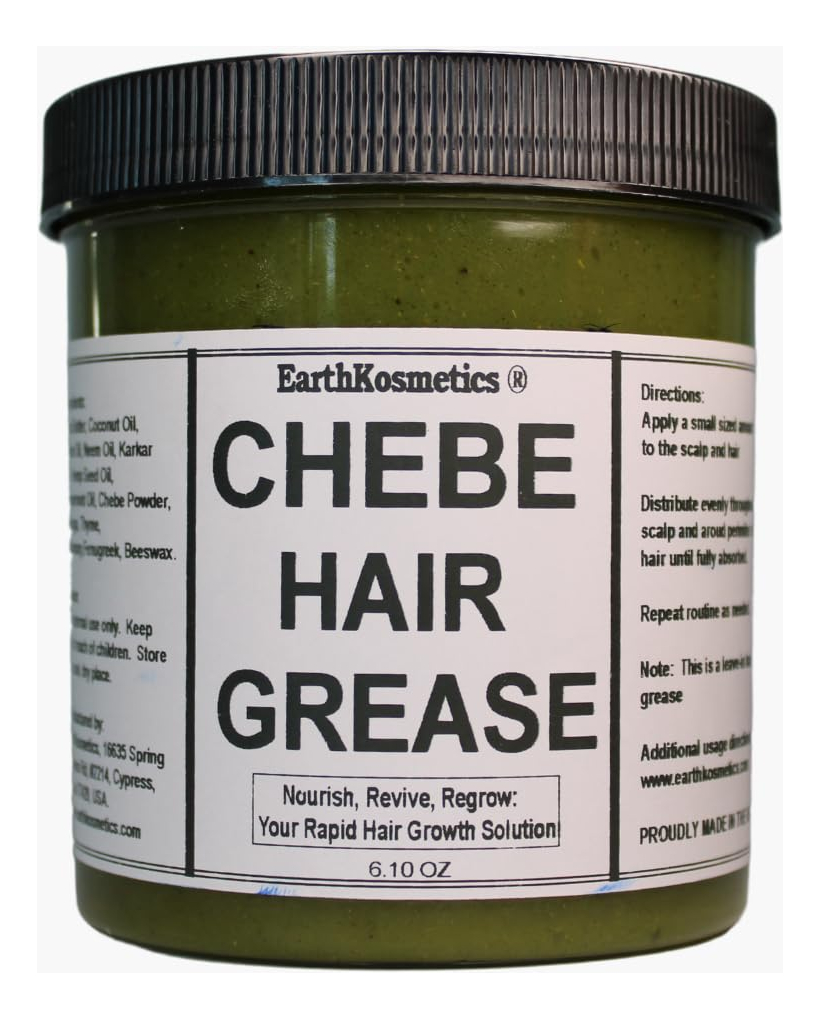 Chebe Hair Grease é uma graxa exclusiva para o crescimento do cabelo, formulada com ingredientes crus e dois óleos poderosos: o óleo de Chebe e o óleo de Karkar, ambos derivados de antigas receitas africanas de crescimento capilar. Nossa graxa de cabelo Chebe penetra profundamente para reparar os folículos e aumentar o fluxo sanguíneo, o que estimula o crescimento do cabelo. Essa graxa também condiciona o couro cabeludo e repara pontas duplas, selando as pontas do cabelo e fortalecendo cada fio de cabelo. É isento de produtos químicos e adequado para todos os tipos de cabelo. Ajuda a restaurar cabelos grossos e saudáveis. O pacote inclui: 1 x Chebe Hair Grease; Quantidade: 6,05 onças – CRESCIMENTO DO CABELO: Nossa graxa Chebe Hair infunde nutrição nos folículos pilosos, auxiliando no crescimento e aumentando o fluxo sanguíneo para estimular o processo de crescimento. Além disso, todos os ingredientes estão em sua forma bruta e são facilmente absorvidos pelo couro cabeludo para começar a funcionar imediatamente. – REPARO CAPILAR: Esta graxa é uma fonte de energia que consiste em dois óleos africanos de crescimento capilar (óleo de Chebe e óleo de Karkar) e várias outras ervas, como óleo de semente de cânhamo para reviver cabelos danificados, óleo de coco para hidratar e curar, feno-grego para penetrar no couro cabeludo para estimular o crescimento, vitamina E para curar pontas duplas e muito mais. Todos eles trabalham juntos para fornecer um tratamento profundo para reparar, nutrir e fazer crescer o cabelo. – TRATAMENTO DO COURO CABELUDO: Esta graxa estimula os folículos capilares, melhorando a circulação sanguínea no couro cabeludo, promovendo um crescimento mais saudável e rápido do cabelo. O aumento do fluxo sanguíneo nutre os folículos, ajudando a revitalizar o couro cabeludo e a manter um cabelo forte e saudável desde a raiz – SEGURO PARA TODOS OS TIPOS DE CABELO: Essa graxa atua no nível do folículo e, como resultado, funciona em todos os tipos de cabelo. Ele é projetado para tipos de ar de 3A a 4C, mechas, cabelos quimicamente tratados, tecidos, tranças e cabelos com todos os níveis de porosidade. Como é facilmente absorvido, não se acumula quando usado diretamente no couro cabeludo ou no cabelo. – NOSSA PROMESSA: A EarthKosmetics visa usar ervas e óleos simples apenas para criar produtos eficazes para o cabelo e a pele. Muitos de nossos produtos são baseados em receitas antigas da África, e nossas ervas e óleos são provenientes de todo o mundo em sua forma crua e não adulterada. O pó Chebe, que forma a base de nossos produtos para cabelo, é obtido diretamente do Chade. Cada ingrediente em cada produto é escolhido a dedo e projetado para uma finalidade específica. O objetivo da EarthKosmetics é fazer com que as pessoas voltem à terra para atender às suas necessidades de cuidados com o cabelo e a pele.