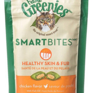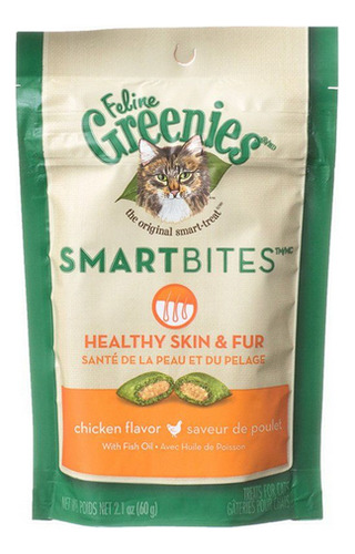 As guloseimas de pele e pele FELINE GREENIES SMARTBITES para gatos são a guloseima perfeita para manter seu gato ronronando. Desenvolvidas por veterinários com óleo de peixe que fornece uma fonte rica e natural de ácidos graxos ômega-3, bem como semente de linhaça moída, essas guloseimas saudáveis para gatos ajudam a manter a pele e o pelo saudáveis. Esses deliciosos petiscos para gatos recomendados por veterinários adicionaram vitaminas, minerais e outros nutrientes para um lanche nutricionalmente completo e balanceado. Além disso, as pequenas guloseimas irresistíveis têm um sabor delicioso de frango e uma deliciosa textura dupla, crocante e macia. Esses FELINE GREENIES são deliciosos petiscos para pele e pelo que seu gato adulto vai adorar. Eles também têm o tamanho perfeito para brinquedos para gatos… experimente colocar alguns dentro de um brinquedo dispensador de guloseimas e veja seu gato perseguir e espancar. Compartilhe com todos os felinos da sua vida e dê a eles guloseimas de pele e pele FELINE GREENIES SMARTBITES para um ronronar de alegria saudável e feliz. Contém um (1) pacote de 2,1 onças de guloseimas naturais FELINE GREENIES SMARTBITES para pele e pele para gatos com sabor de frango. Feito com óleo de peixe que fornece uma fonte rica e natural de ácidos graxos ômega-3 e semente de linhaça moída para ajudar no cuidado da pele e na manutenção do pelo saudável do seu gato. Guloseimas naturais para gatos elaboradas com ingredientes naturais, além de vitaminas, minerais e outros nutrientes para um lanche nutricionalmente completo e balanceado. Com menos de 2 calorias por guloseima, seu gato vai adorar cada mordida e você se sentirá bem em recompensá-lo com uma guloseima de baixa caloria. Crocante por fora e macio por dentro, seu gato devorará esses petiscos e sua deliciosa textura dupla. Essas guloseimas pequenas não têm sabores artificiais, conservantes ou enchimentos artificiais. Cuidados com a pele e a pelagem. Natural.