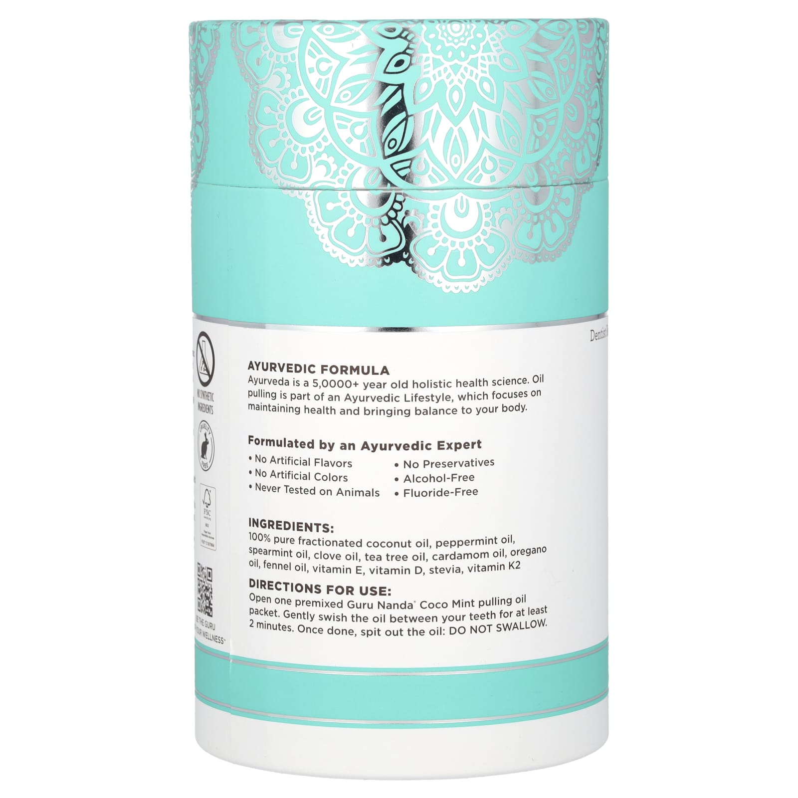 Abra um sachê de óleo de extrato de Menta de Coco pré-misturado Guru Nanda®. Bocheche suavemente o óleo entre os dentes por pelo menos 2 minutos. Quando terminar, cuspa o óleo: Não ingira.