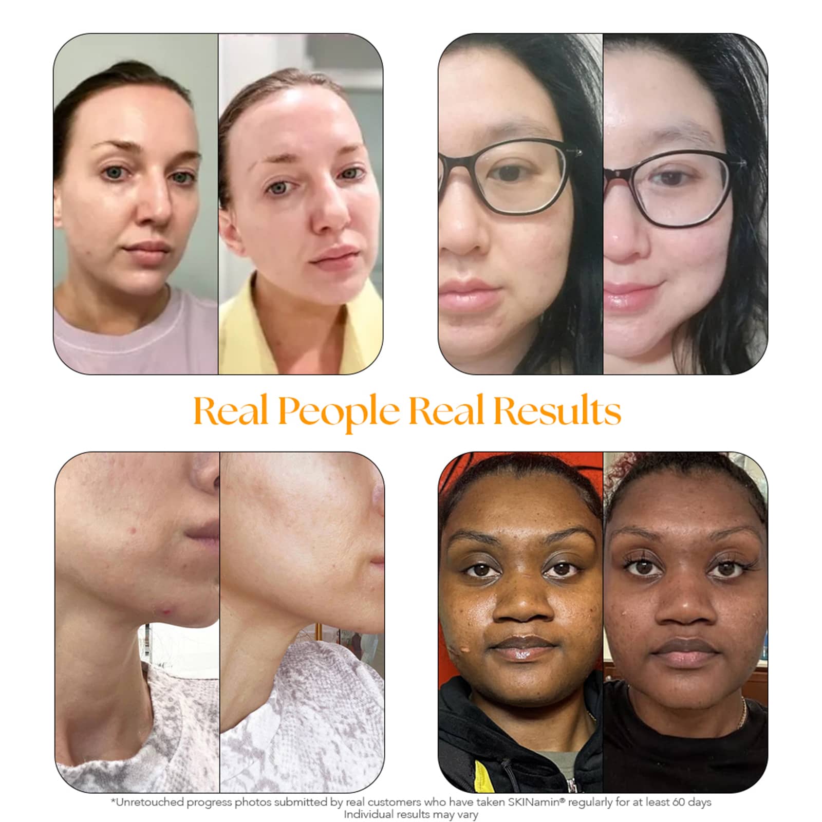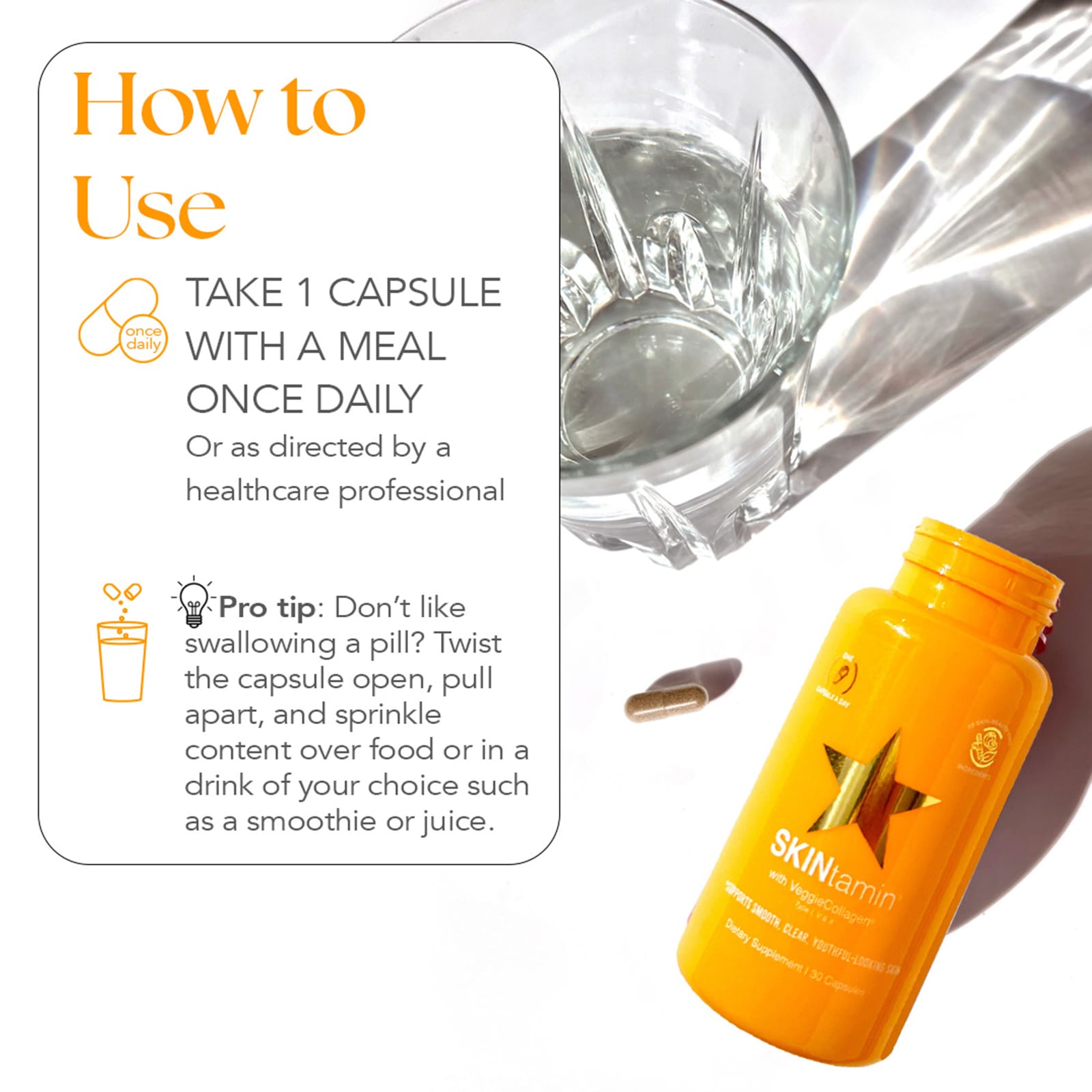 SKINtamin® é uma fórmula abrangente embelezador da pele, tomada uma vez ao dia, com 22 ingredientes naturais, incluindo amla orgânica, extrato de açafrão, resveratrol, vitaminas A, C, E, B12, zinco, ácido hialurônico e nosso patenteado VeggieCollagen® (tipo I, V e X) para manter uma pele macia, clara e com aparência jovem de dentro para fora.