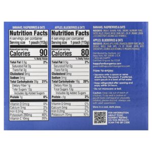 Bananas, Raspberries & Oats: Organic banana puree, organic raspberry puree, water, milled organic whole grain oats, <2% of: Organic lemon juice concentrate, ascorbic acid (vitamin c).