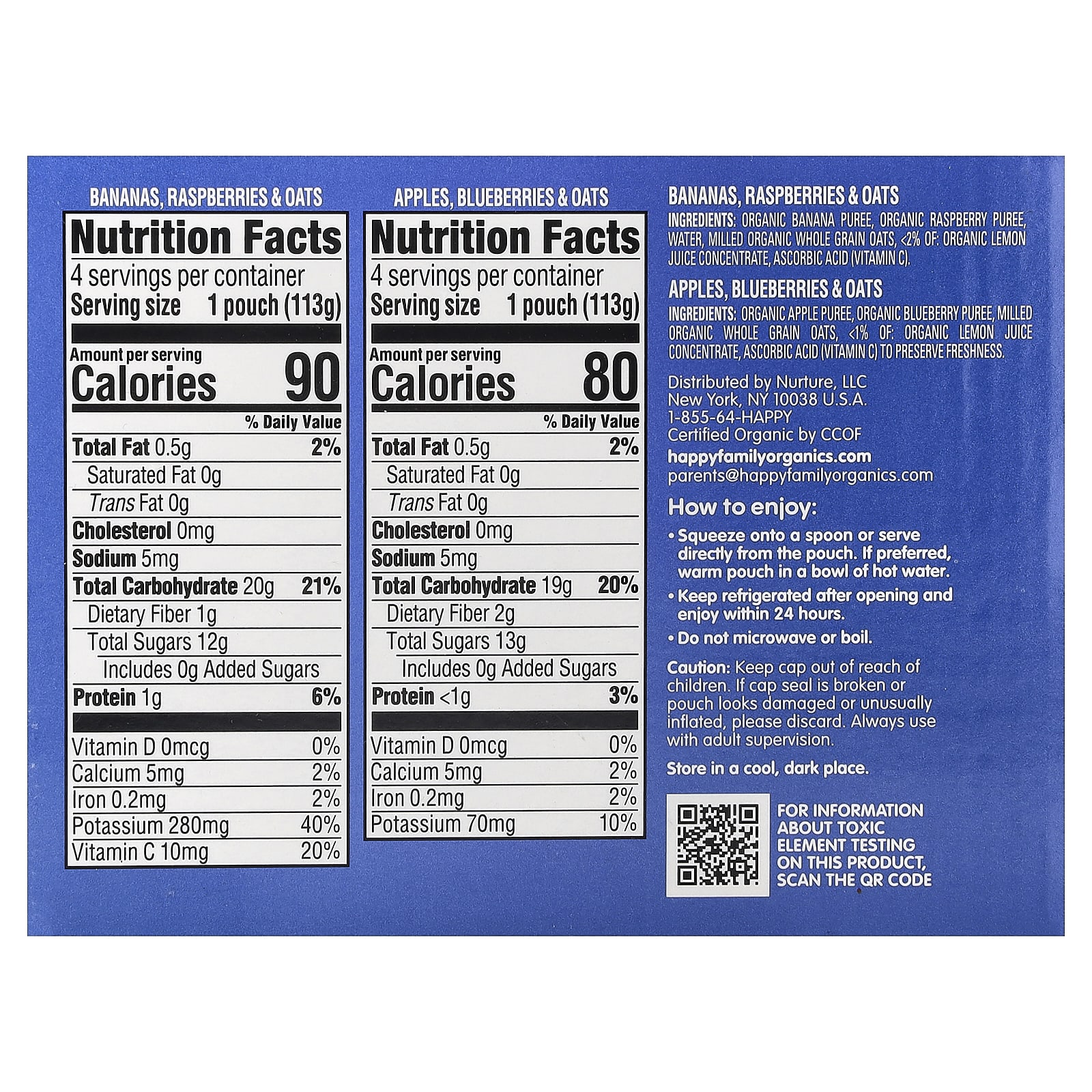 Apples, Blueberries & Oats: Organic apple puree, organic blueberry puree, milled organic whole grain oats, <1% of: Organic lemon juice concentrate, ascorbic acid (vitamin c) to preserve freshness.