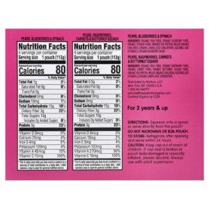 Peras, Mirtilos & Ingredientes do Espinafre: Purê de pera orgânica, purê de mirtilo orgânico, purê de espinafre orgânico, proteína de ervilha orgânica, sementes de chia orgânica moída, concentrado de suco de limão orgânico, ácido ascórbico (vitamina C), sabor de mirtilo orgânico.
