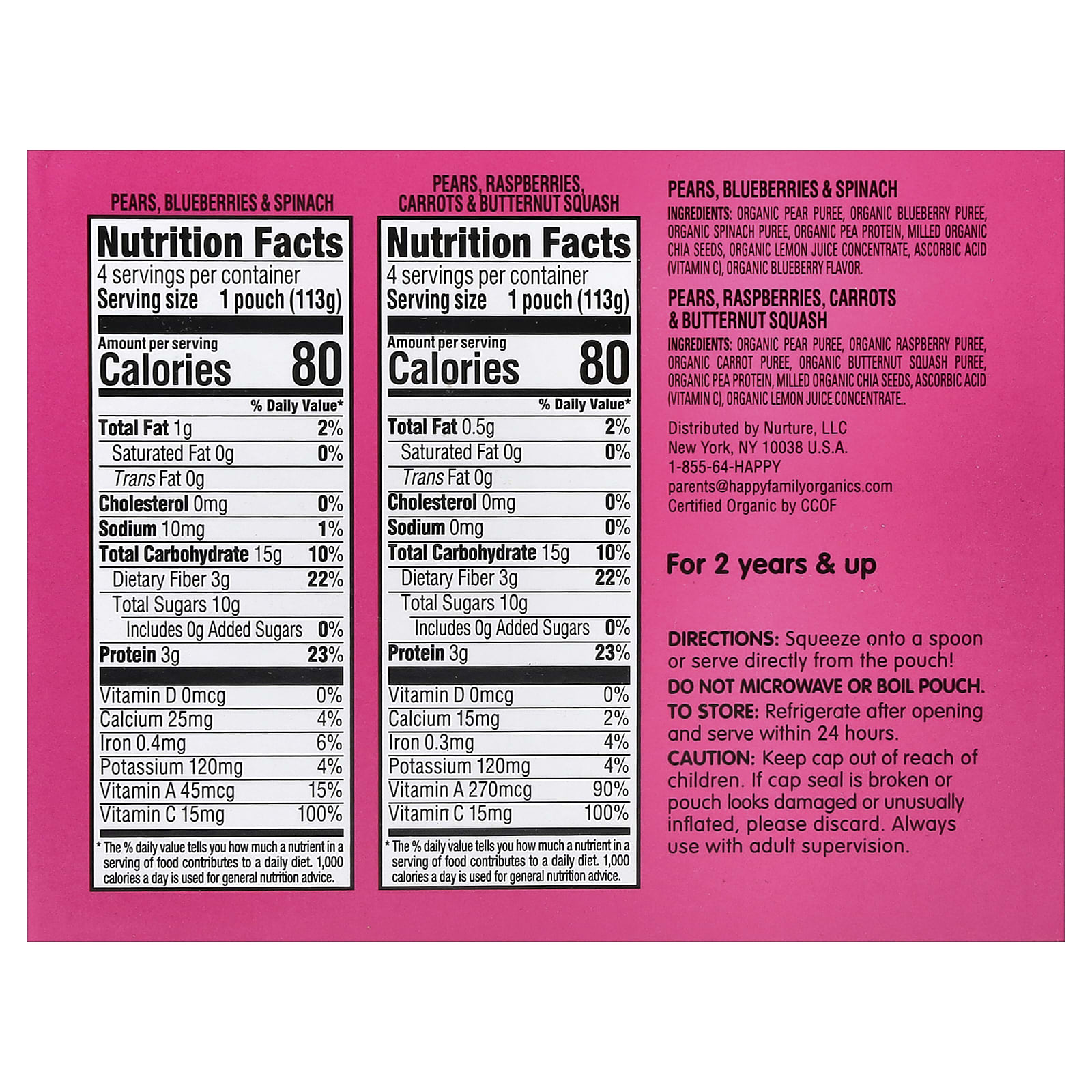 Peras, Framboesa, Cenouras e & Ingredientes da Abóbora-Menina: Purê de pera orgânica, purê de framboesa orgânica, purê de cenoura orgânica, purê de abóbora-menina orgânica, proteína de ervilha orgânica, sementes de chia orgânica moída, ácido ascórbico (vitamina C), concentrado de suco de limão orgânico.